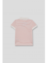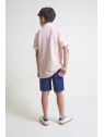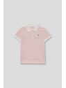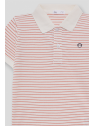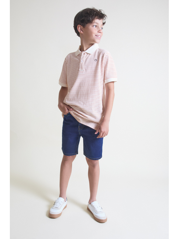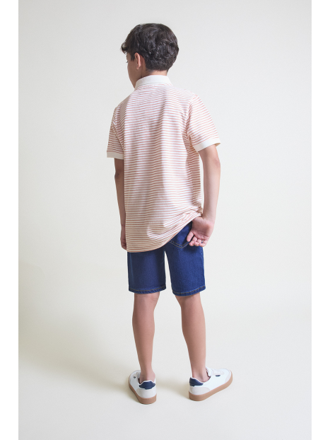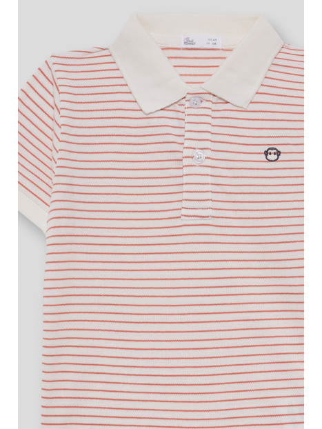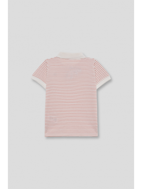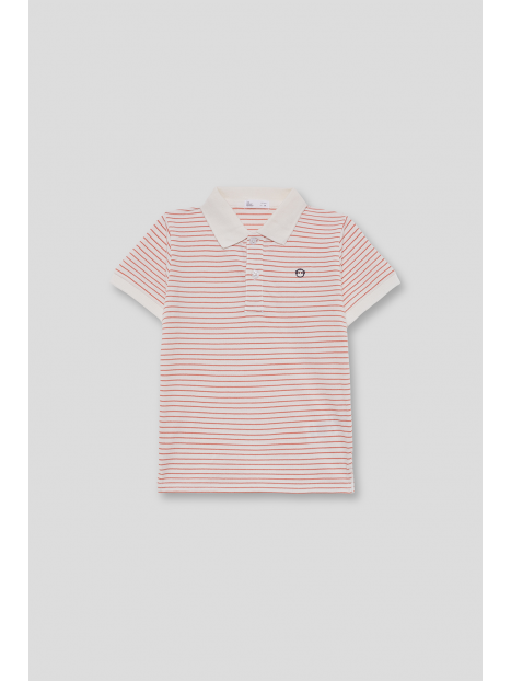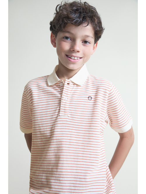 Polo de manga corta disponible en color crudo con rayas coral, en tallas de 2 a 16 años.