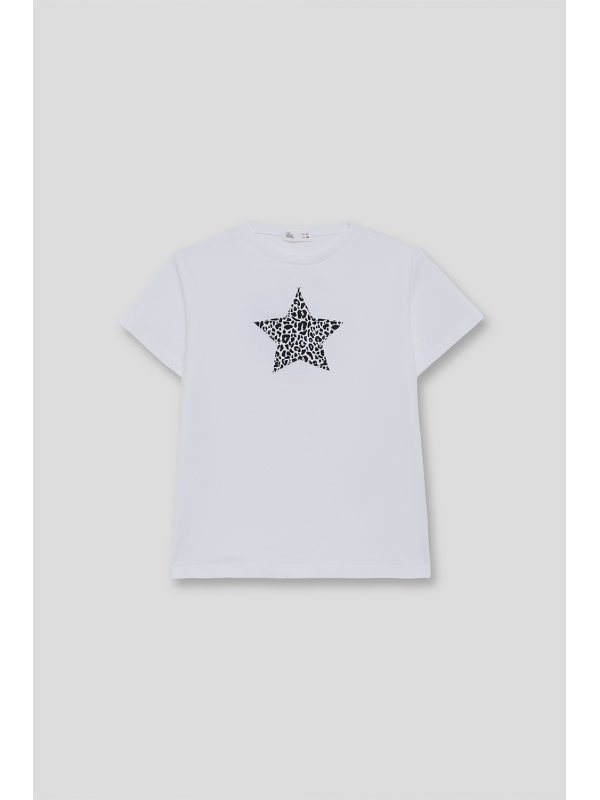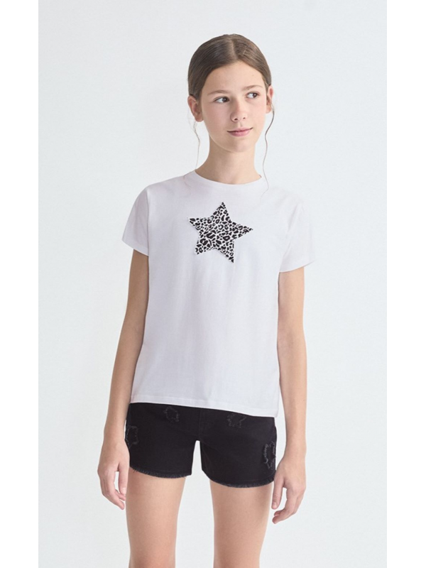 Camiseta de manga corta para niña de 2 a 16 años en color blanco. Estampado central de estrella con print animal en negro, confeccionada en algodón suave y cómodo.