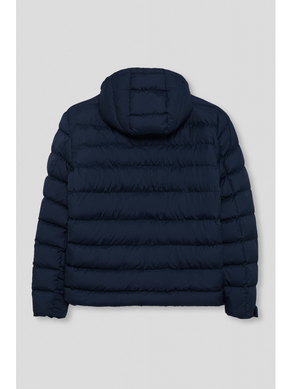 Diseño de manga larga con capucha integrada y cierre de cremallera frontal. Presenta bolsillos laterales con cremallera y acabado acolchado horizontal que asegura confort y estilo urbano.