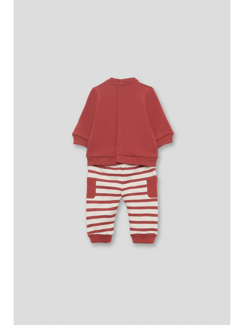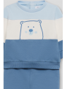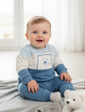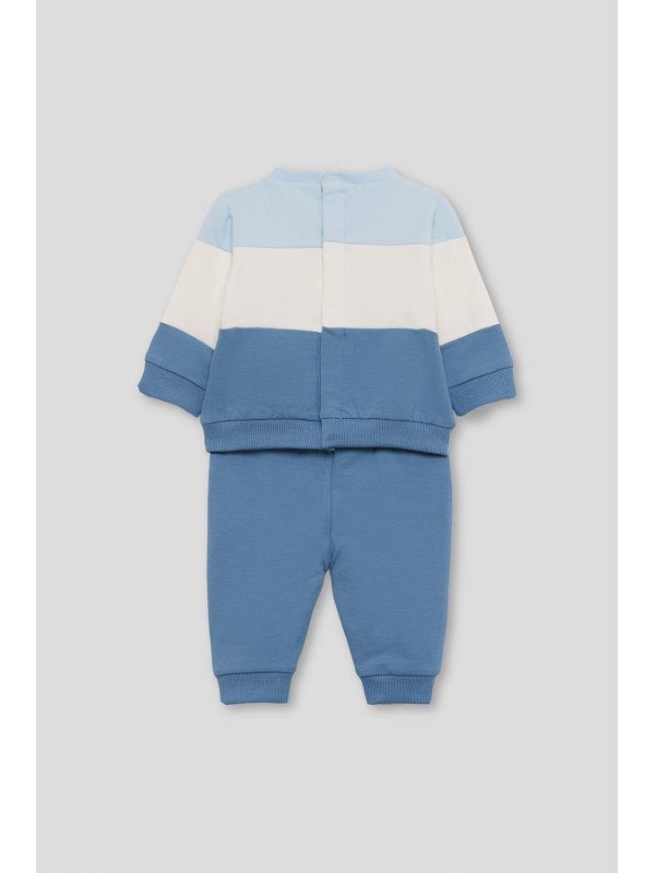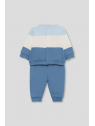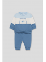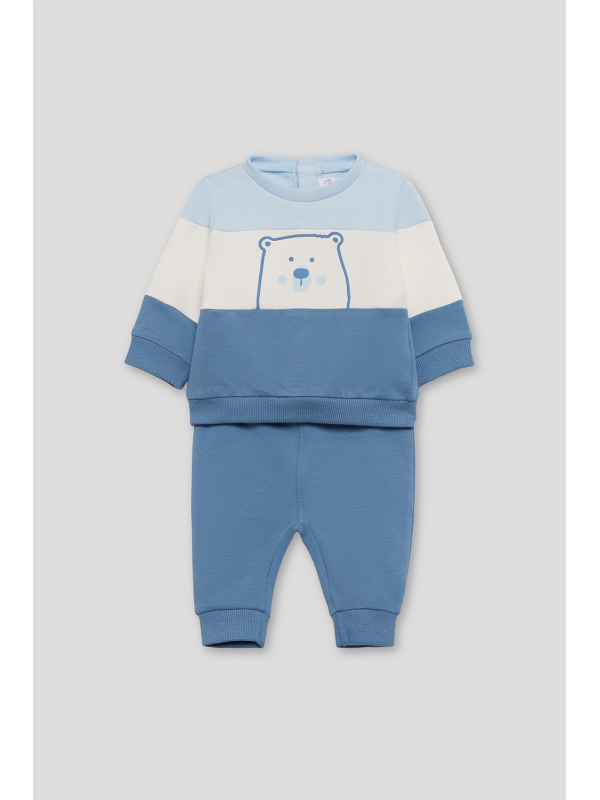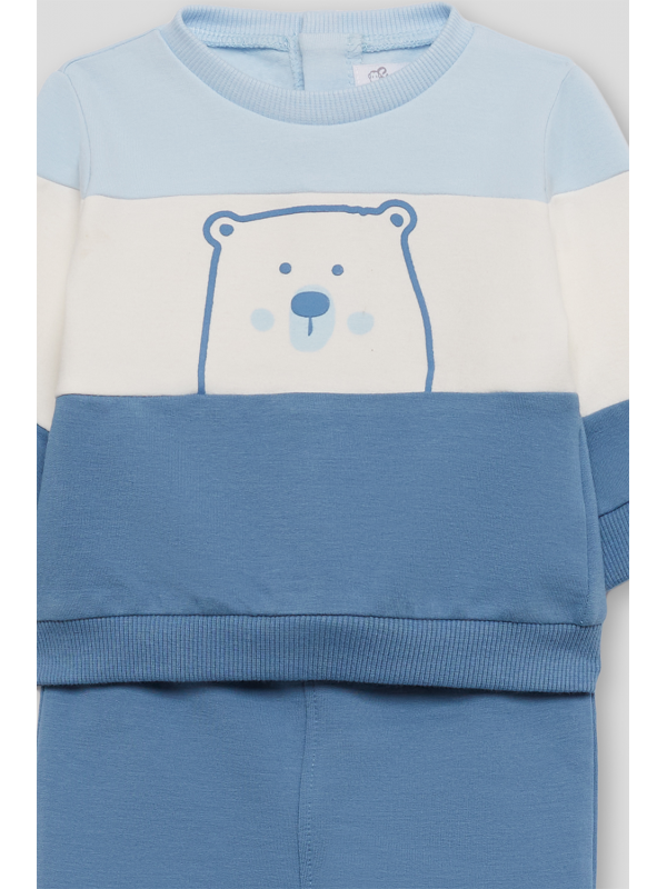 Conjunto de dos piezas, sudadera y pantalón para bebé niño de 1 a 24 meses. Confeccionado en felpa perchada, este conjunto incluye una sudadera en bloques de color azulina, blanco y celeste, con un simpático estampado de oso polar en el centro. El diseño presenta cuello redondo, manga larga y cierre trasero con automáticos para facilitar la puesta. El pantalón largo, en azulina a juego, cuenta con cinturilla elástica y bajos con puño para mayor comodidad. Un conjunto cálido, divertido y perfecto para el día a día de los más pequeños.