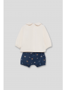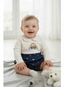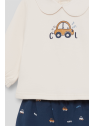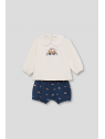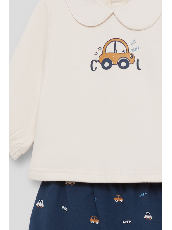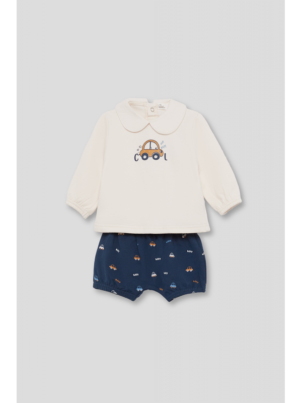 Camiseta de manga larga en color crudo con cuello bebé y estampado central de coche con el texto “Cool”. Lleva abertura trasera con botones para facilitar el cambio. Los shorts en azul noche presentan un divertido estampado de coches y palabras, con cintura elástica para mayor comodidad.