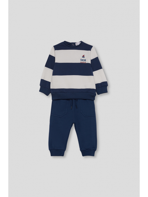 Conjunto de dos piezas, sudadera y pantalón para niño de 3 meses a 6 años. Sudadera de felpa perchada en color crudo con cuello redondo, puños de canalé y cierre con botón a presión en la parte trasera. Presenta un simpático estampado frontal de osito en tonos azules y la frase "Let’s explore". El pantalón es de punto en color azul noche, con cintura elástica y cordón decorativo, y bajo acabado en canalé. Disponible también en color mostaza con el mismo estampado en versión marrón. Un conjunto calentito, cómodo y muy divertido para el día a día.
