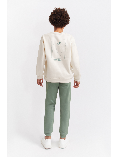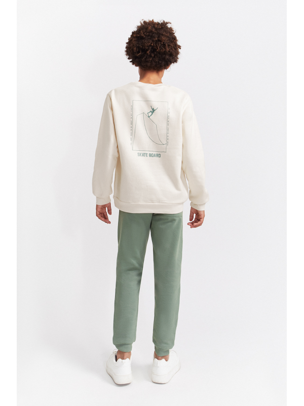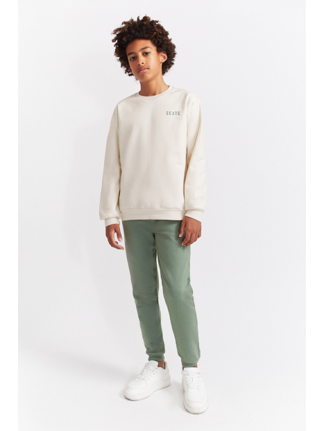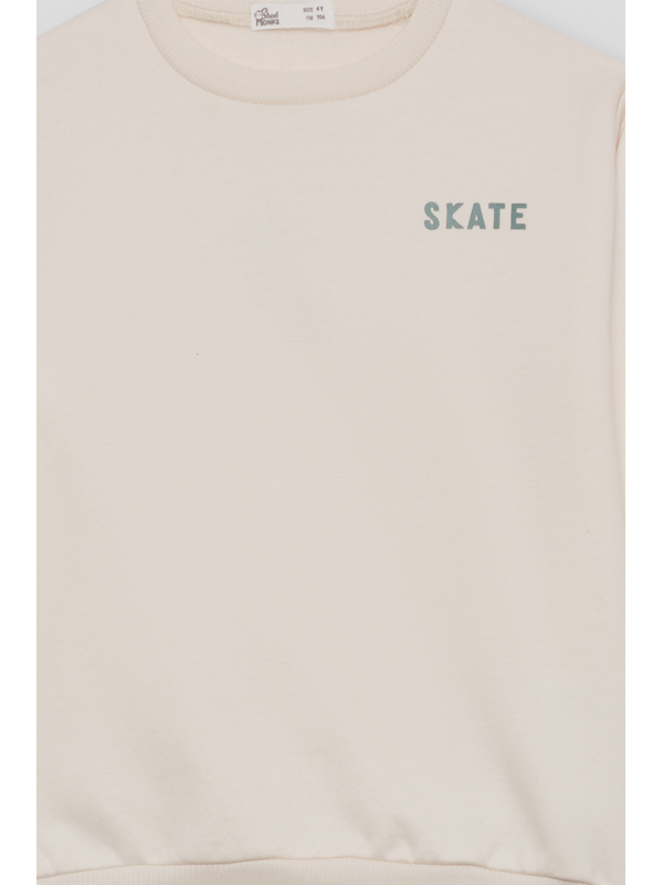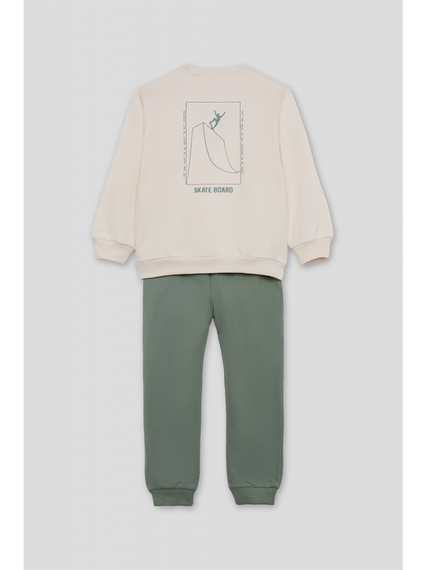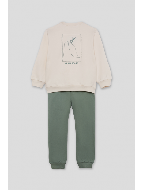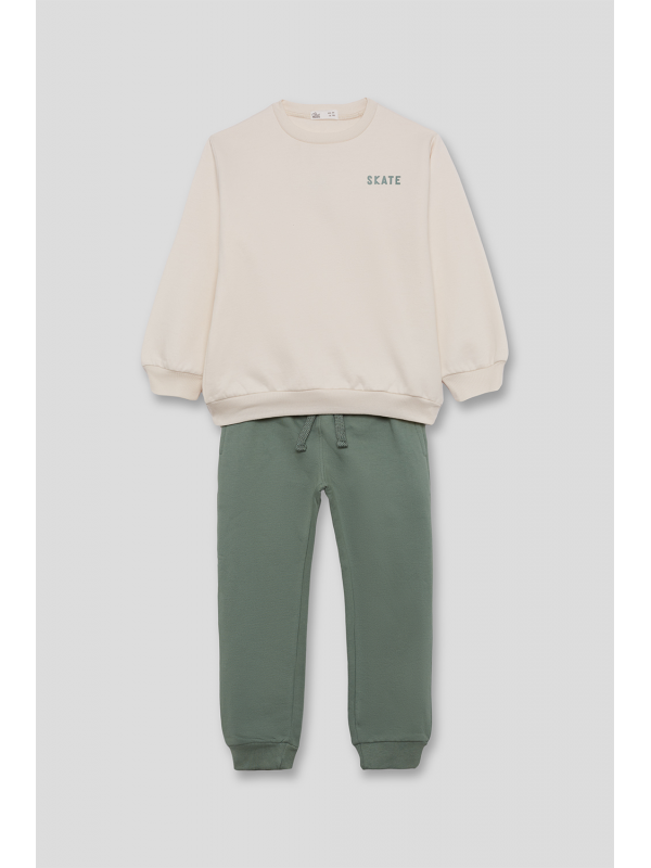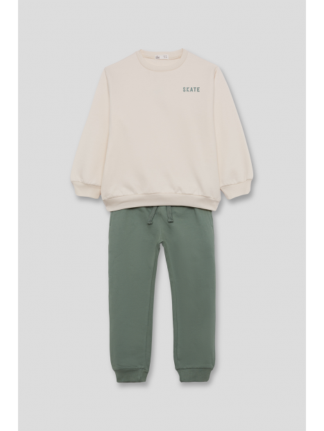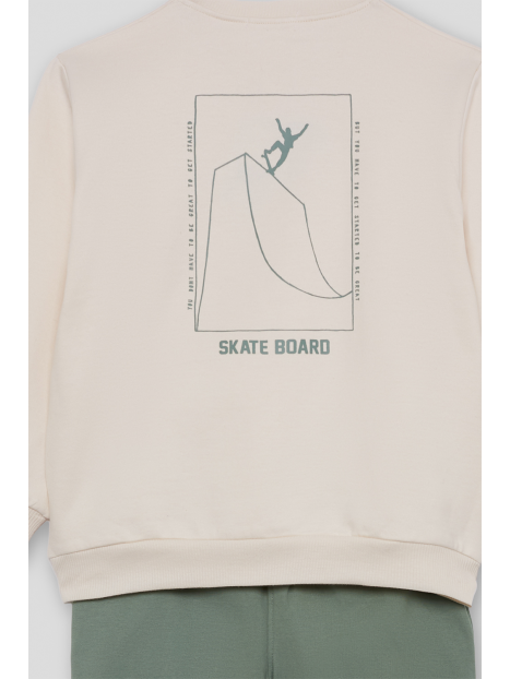 Conjunto de dos piezas, sudadera y pantalón para niño de 2 a 16 años. Sudadera de manga larga con cuello redondo, disponible en dos colores: azul y crudo. Ambas versiones presentan detalle frontal con texto “SKATE” en el pecho y gráfico grande en la espalda con ilustración de rampa de skate y tipografía en contraste. Acabados en canalé en puños, cuello y bajo para mayor comodidad. El pantalón es tipo jogger, en color azul marino o verde amazona según el conjunto, con cintura elástica y bajo ajustado. Un look moderno y cómodo, perfecto para los pequeños skaters de espíritu urbano.
