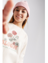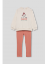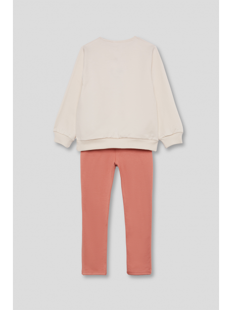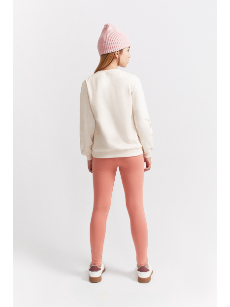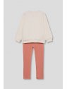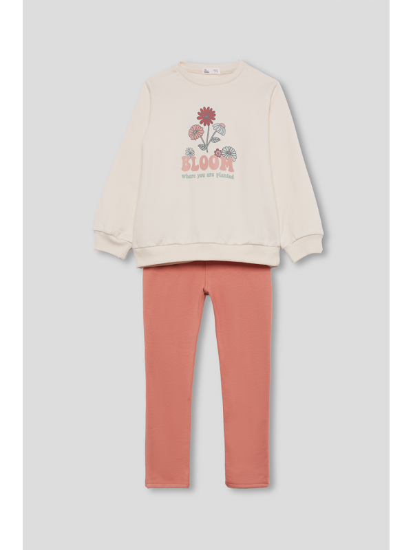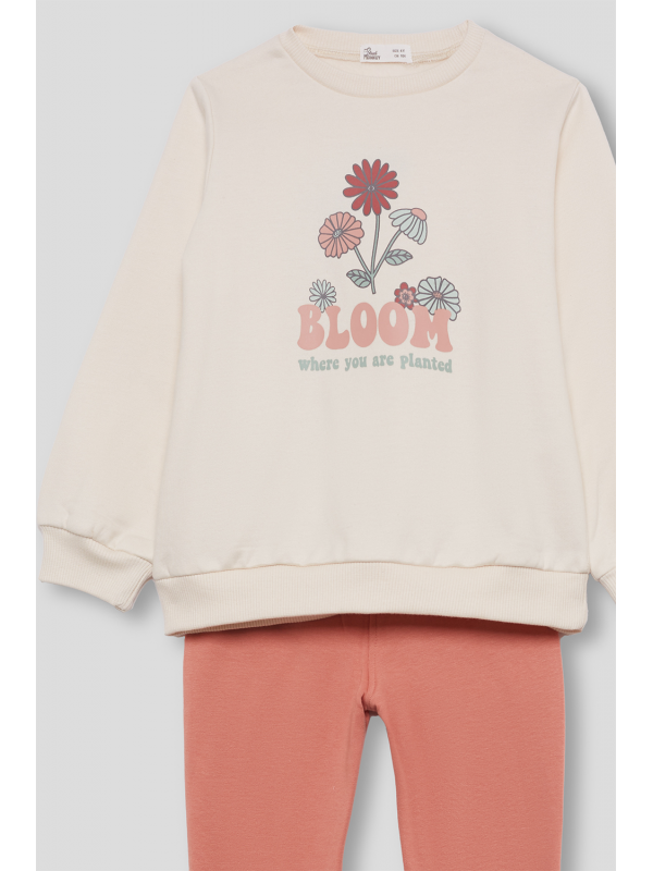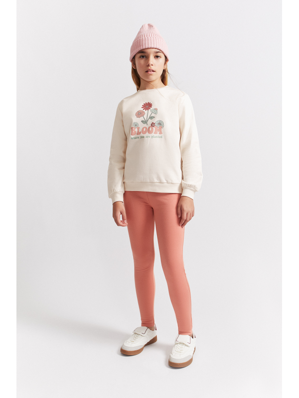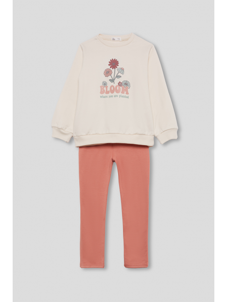 Sudadera de felpa perchada en color verde claro o crudo, con cuello redondo, manga larga y acabados de canalé en puños y bajo. El diseño se completa con un estampado frontal floral en tonos pastel y el mensaje “BLOOM where you are planted” que aporta un aire alegre y optimista. Leggings a juego en verde seco o maquillaje, confeccionados en punto elástico con cintura cómoda. Un conjunto cálido y flexible, ideal para acompañarla en sus planes de invierno.