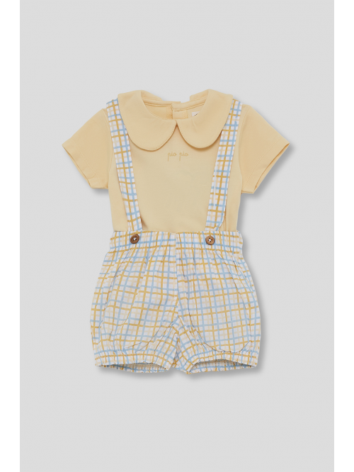 Camiseta en color amarillo con cuello bebé y detalle bordado "pío pío" en el pecho. Ranita de tirantes en tejido de cuadros amarillos y celestes, con botones decorativos y cintura elástica para mayor comodidad.