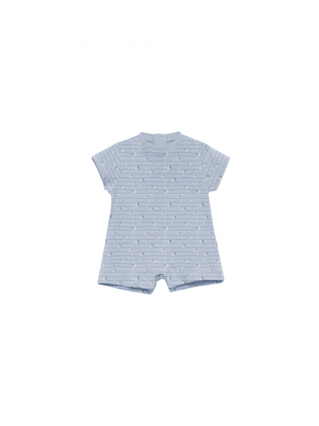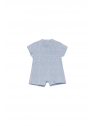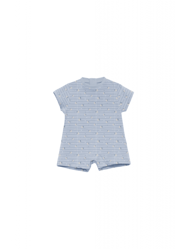 En color celeste y crudo con estampado de rayas y pequeños motivos marinos. Cuello redondo y cierre con botones a presión en la espalda y entrepierna para facilitar el cambio.