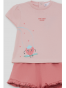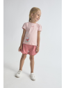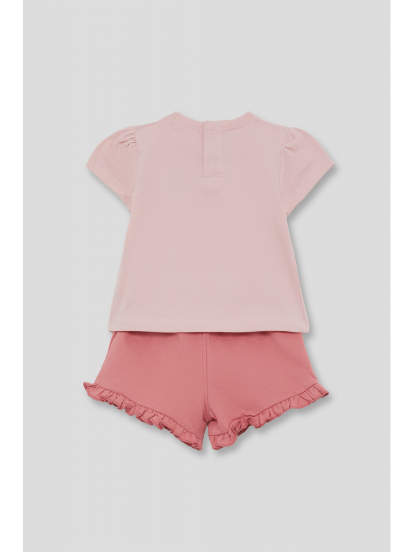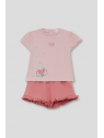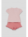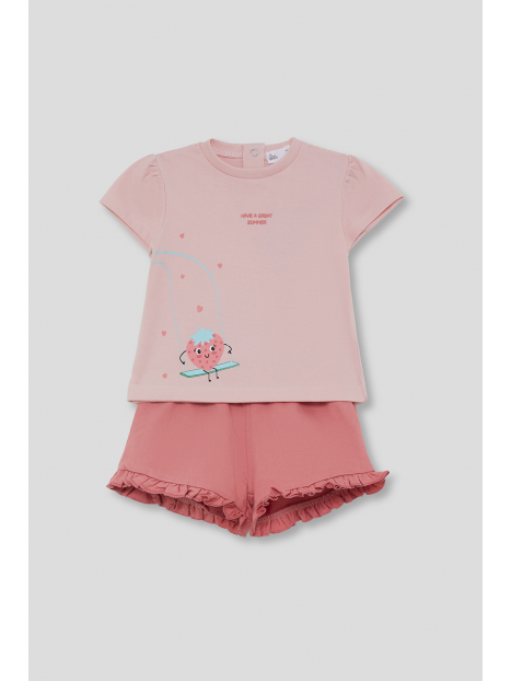 Camiseta en color rosa claro con estampado de fresa y cierre de botones en la espalda. Shorts a juego en tono rosa con detalle de volantes en el bajo.