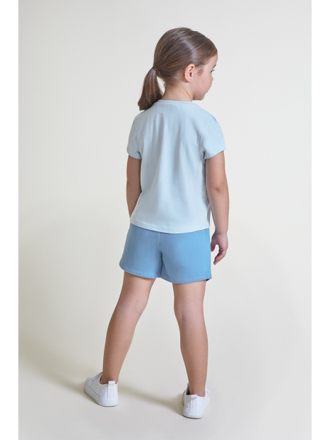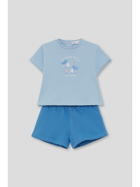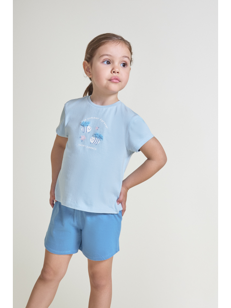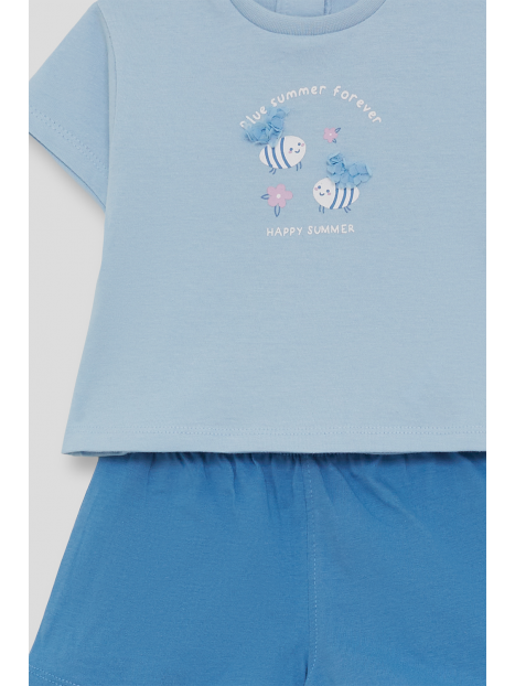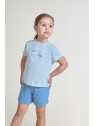 Conjunto de dos piezas, camiseta y shorts para bebé niña de 3 meses a 6 años. Camiseta azul claro con estampado de pececitos y mensaje veraniego. Shorts en azul intenso con cintura elástica para mayor comodidad.