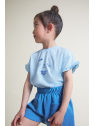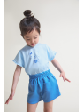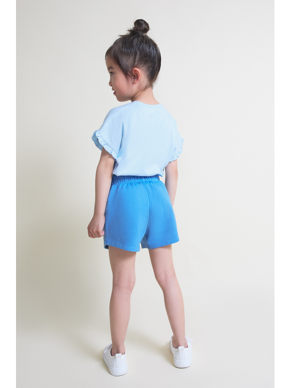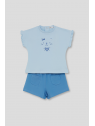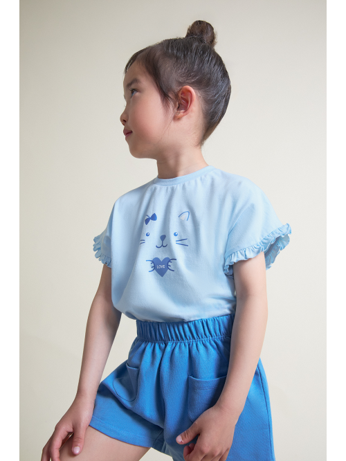 Camiseta celeste con estampado de gatito y detalles de volantes en las mangas, con cierre de botones en la espalda. Shorts a juego en azul con bolsillos delanteros y cintura elástica. Un look cómodo y alegre para el verano.