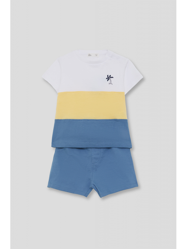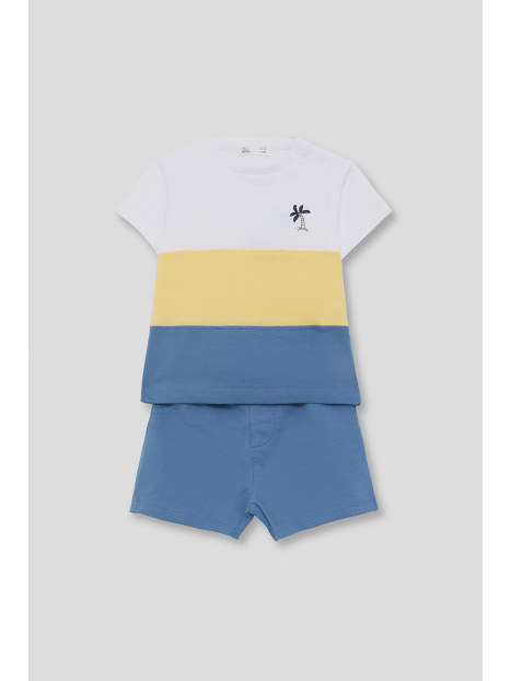 Camiseta de manga corta a rayas en bloques de color blanco, amarillo y azul, con pequeño bordado de palmera en el pecho. Shorts en azul medio con cintura elástica para un ajuste cómodo.