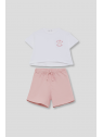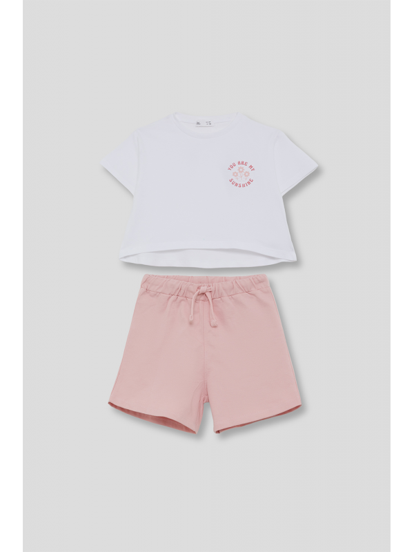 Camiseta blanca con estampado “You Are My Sunshine” y shorts rosa con cintura ajustable. Tejido suave y cómodo, ideal para looks frescos y versátiles en verano.