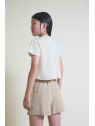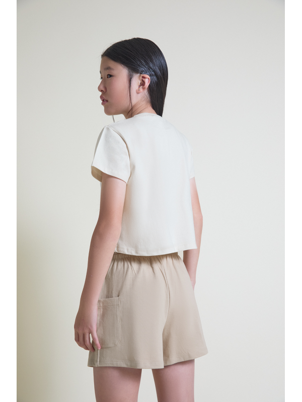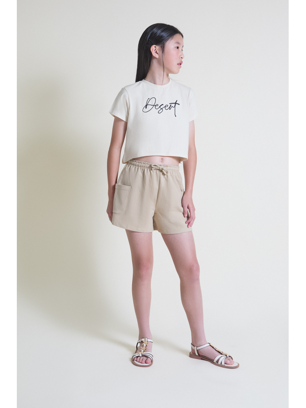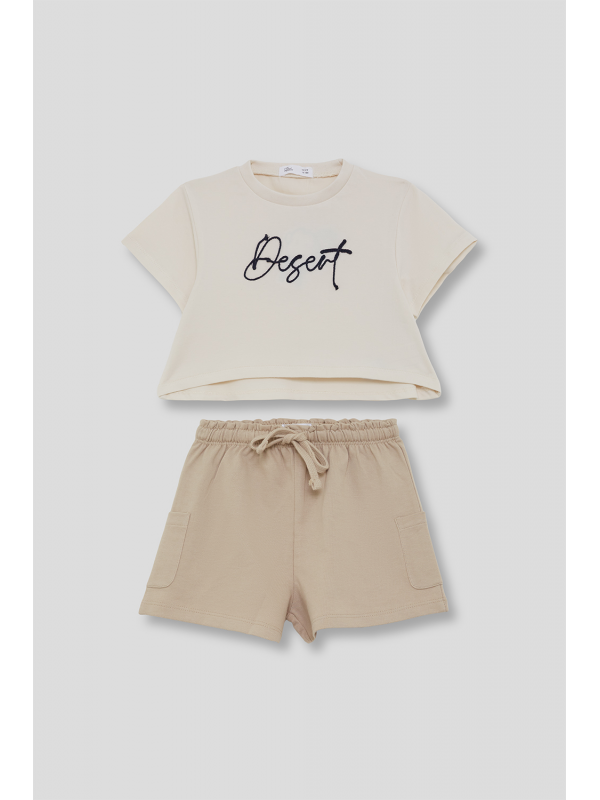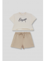 Camiseta beige con texto en relieve y shorts arena con cintura ajustable. Tejido suave y cómodo para el verano.