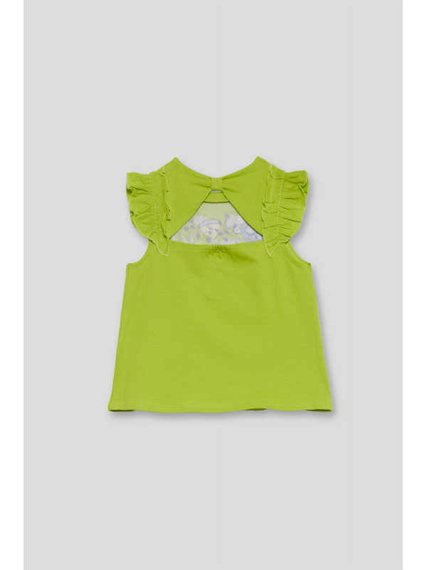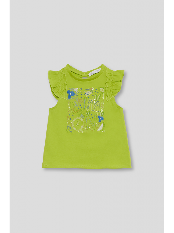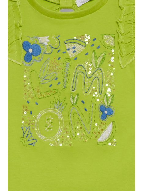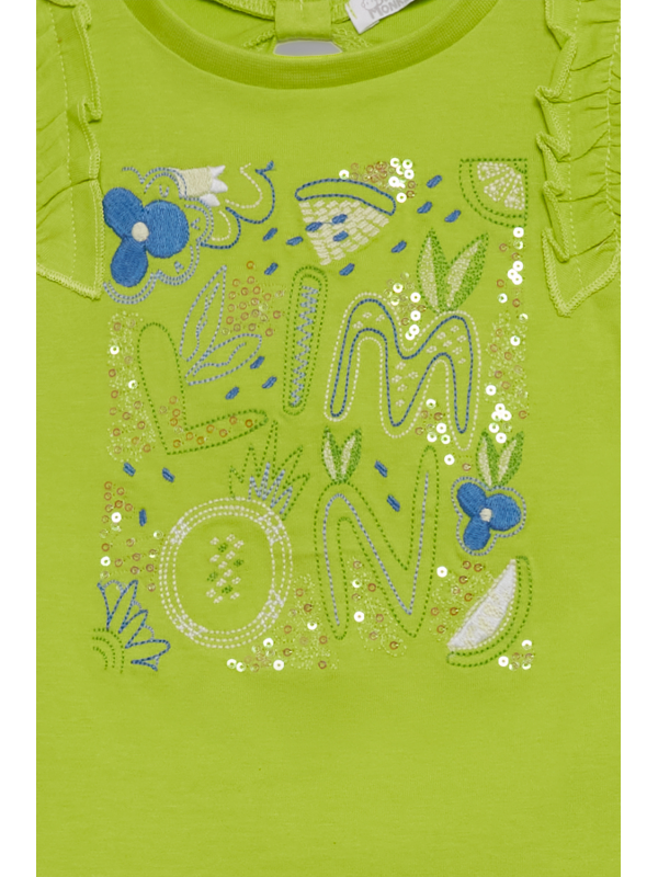 Camiseta sin mangas en vibrante tono verde lima. Su diseño destaca con volantes en los hombros y un delicado estampado con la palabra "LIMÓN" decorada con lentejuelas y pequeños bordados florales en tonos azules y blancos.