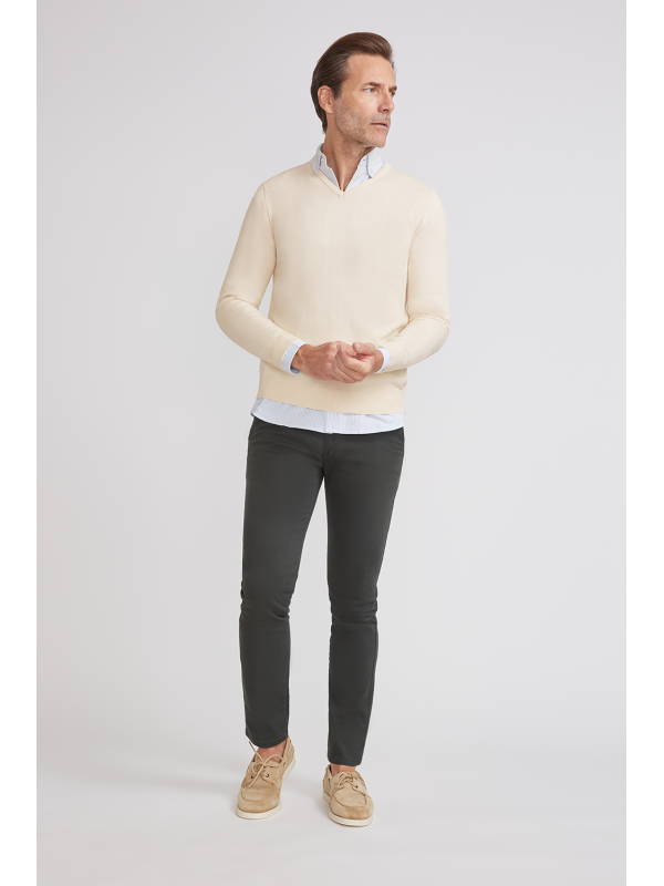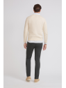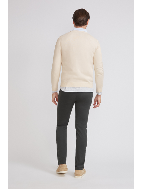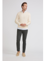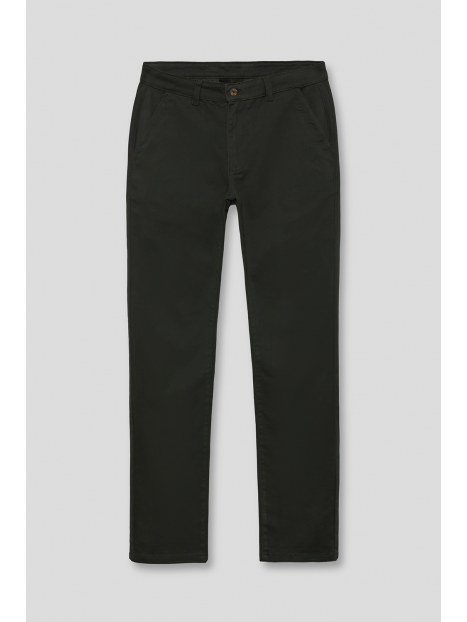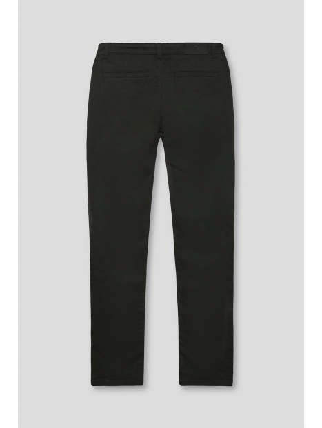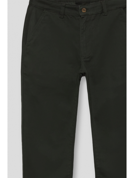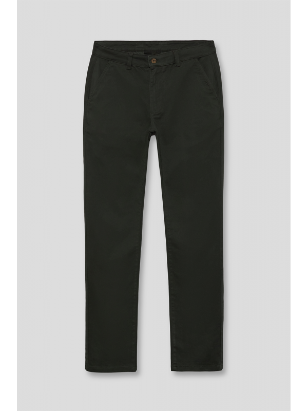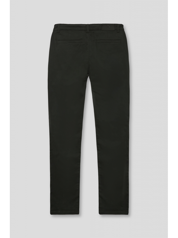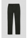 Pantalón estilo chino con cierre central mediante botón y cremallera, dos bolsillos en el frontal y dos en la parte trasera con detalle personalizado a contraste sobre uno de ellos. Corte recto.