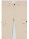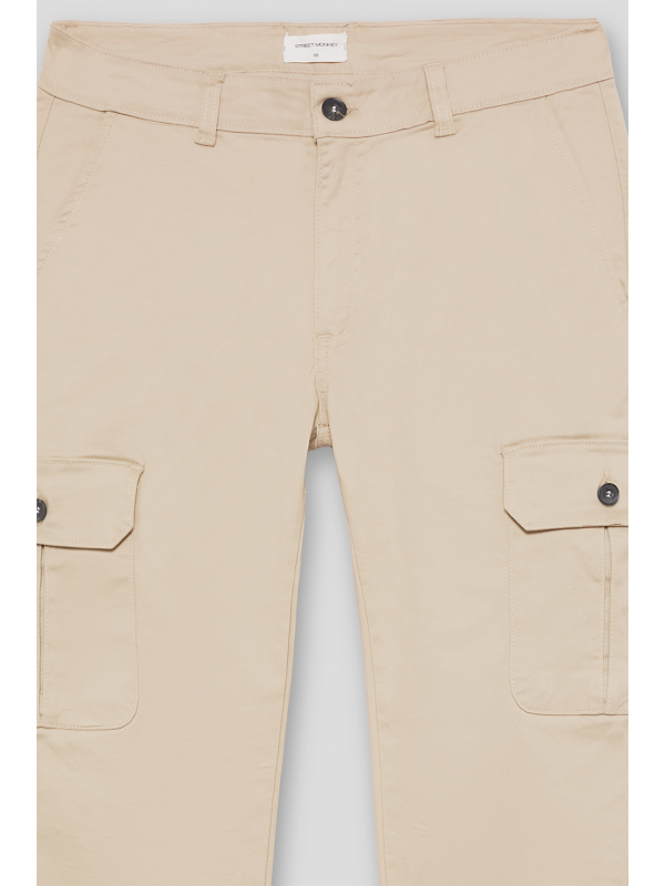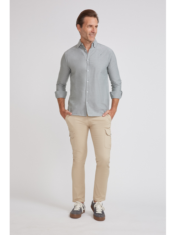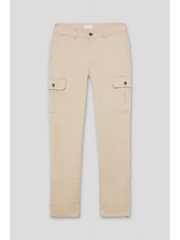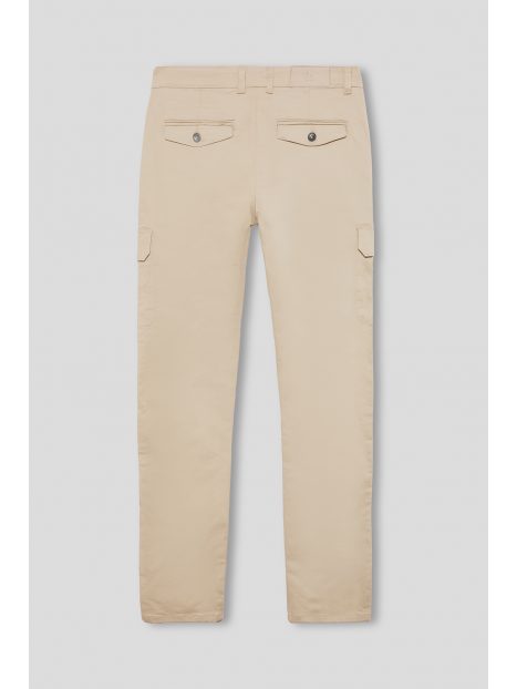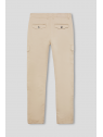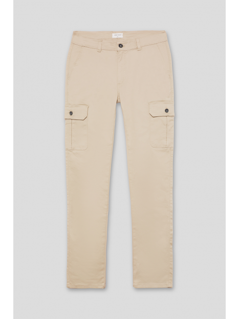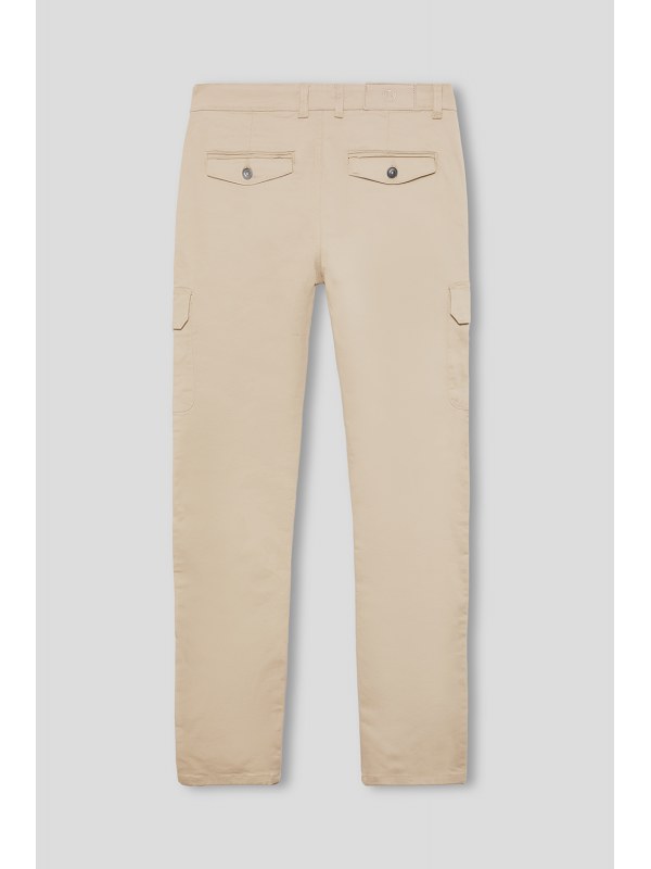 Pantalón cargo con cierre central mediante botón y cremallera. Dos bolsillos frontales y dos más bajos con cierre mediante tapeta y botón. Dos bolsillos traseros y detalle personalizado sobre uno de ellos. Corte recto.