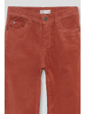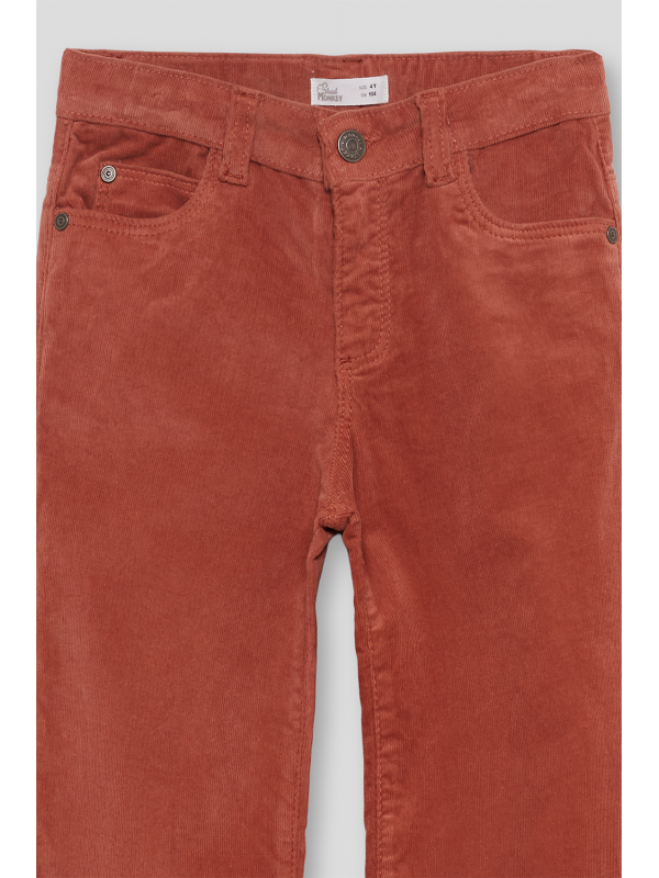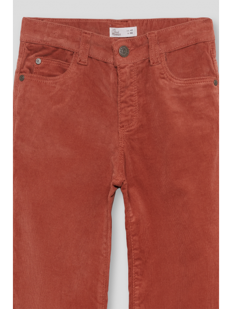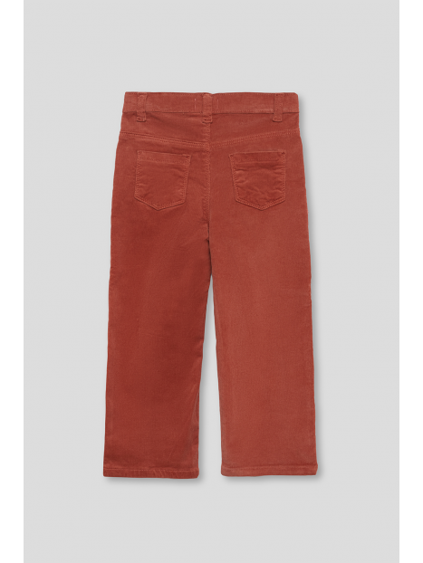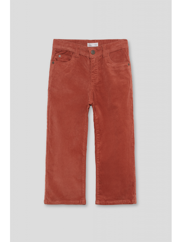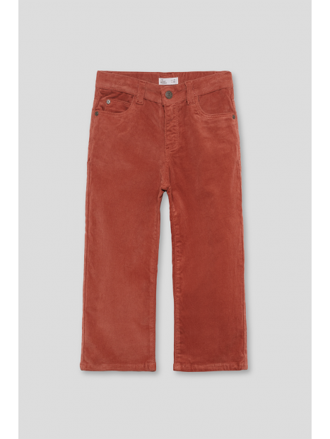 Pantalón largo en color tinto, confeccionado en suave tejido de pana con corte recto y diseño de cinco bolsillos. Presenta cierre con botón y cremallera, trabillas para cinturón y cintura ajustable con goma interior.