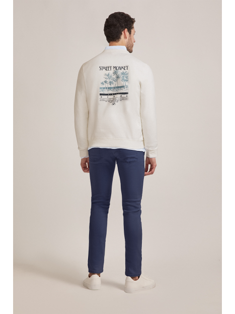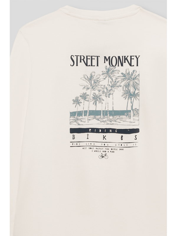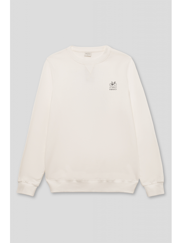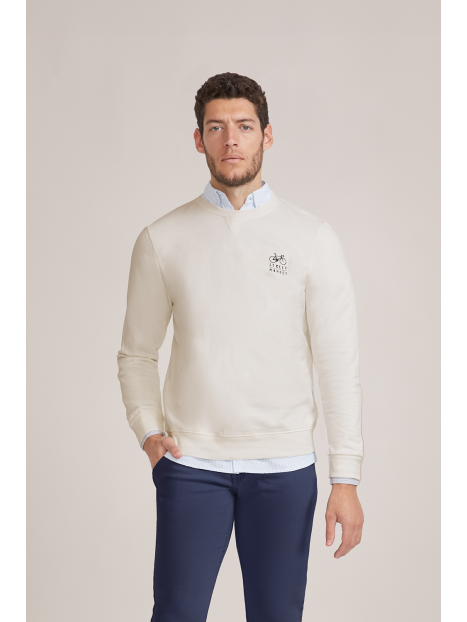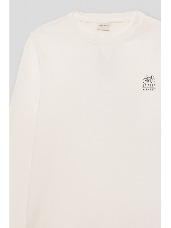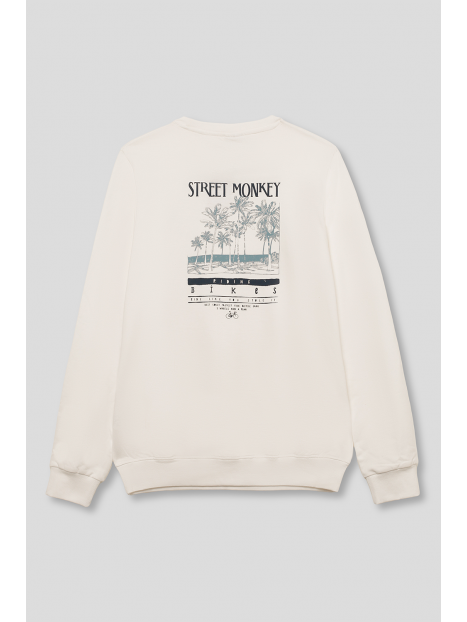 Sudadera en color crudo con estampado personalizado en el frontal y en la parte trasera. Cuello redondo y manga larga, confeccionada en tejido de algodón con el interior sin afelpar. Corte regular fit.