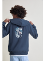 Diseño con cremallera frontal, bolsillos tipo canguro y estampado pequeño en el pecho.