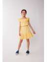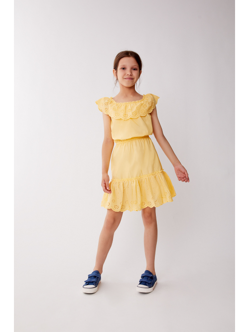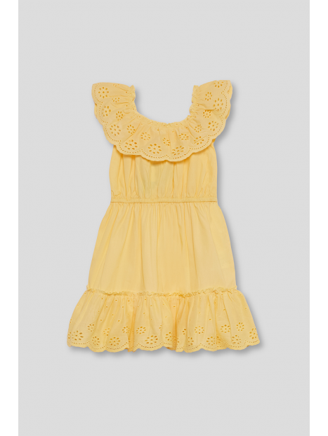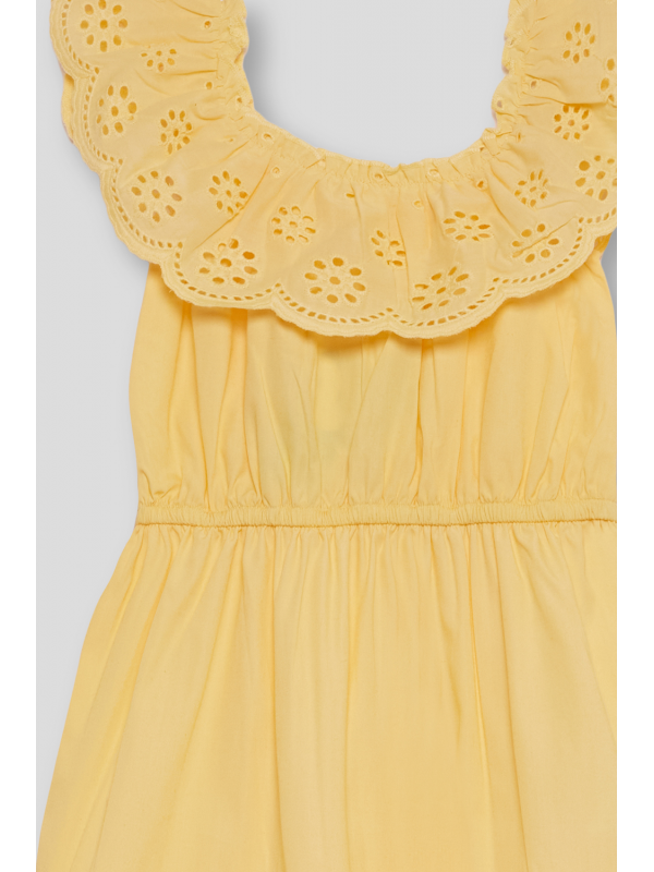 La cintura elástica realza la silueta con un ajuste cómodo, mientras que la falda con un volante amplio y detalles calados añade movimiento y frescura. Confeccionado en un tejido ligero y transpirable, es perfecto para los días soleados y ocasiones especiales.