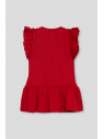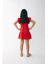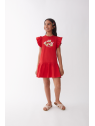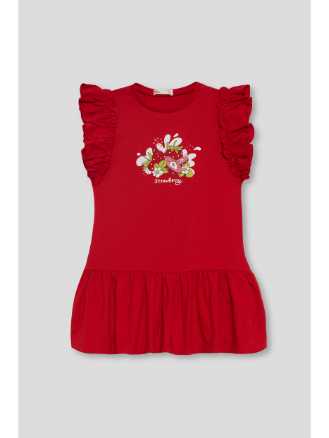 Vestido en color rojo vibrante destaca por su diseño con mangas de volantes fruncidos y un estampado frontal de fresas y kiwi, que aporta un toque fresco y divertido. Su silueta cómoda se complementa con una falda con vuelo, ideal para moverse con libertad y estilo.