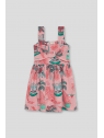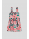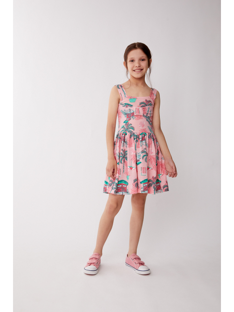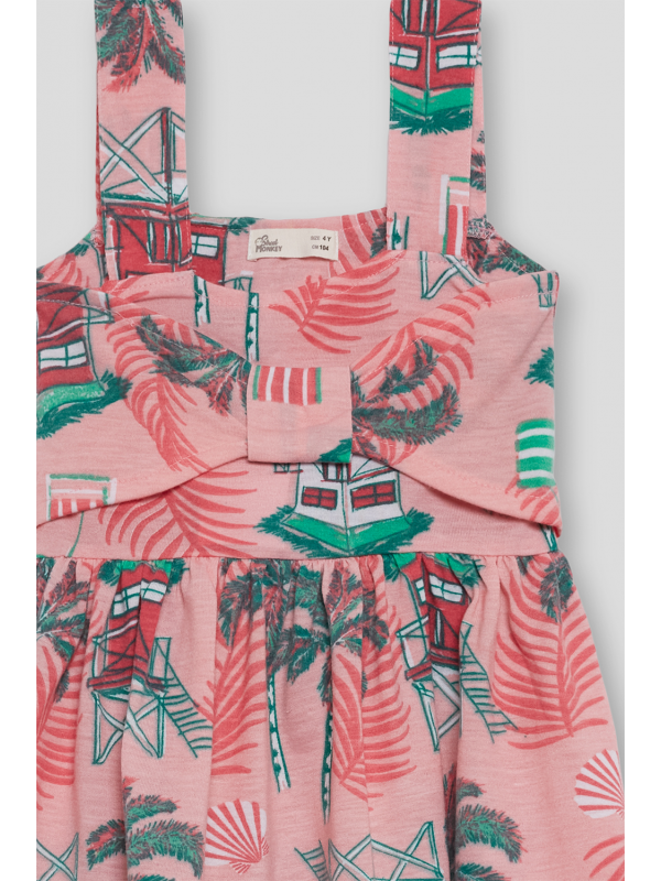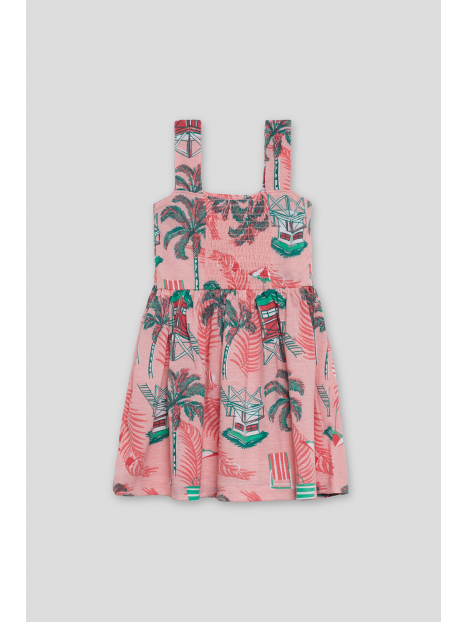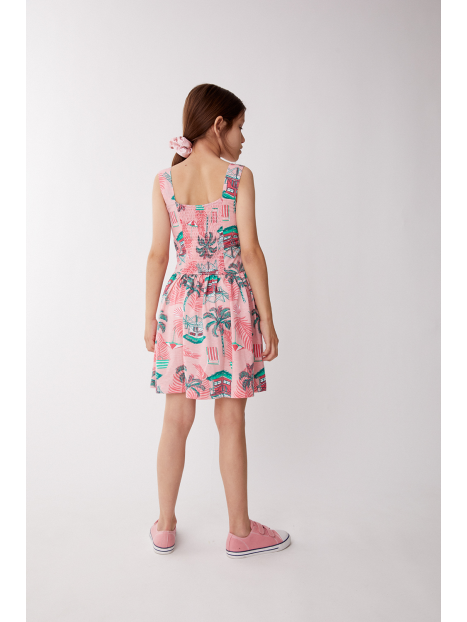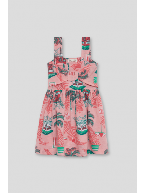 Vestido de tirantes en un suave tono rosa con un alegre estampado tropical de casitas playeras, palmeras y hojas en tonos verdes y rojos. Diseño con escote cuadrado y detalle de lazada decorativa en el pecho que aporta un toque encantador. La falda con vuelo y corte evasé garantiza una caída fluida y cómoda.