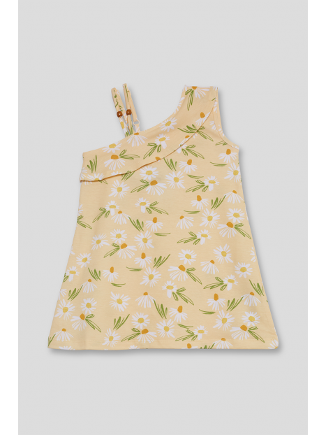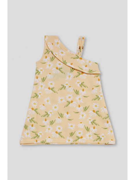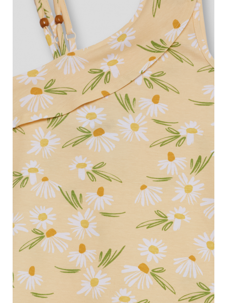 Vestido de tirantes para niña de 2 a 16 años. Vestido de tirantes con un vibrante estampado tropical sobre fondo azul marino, perfecto para los días de verano. Su diseño con escote recto y finos tirantes garantiza frescura y comodidad. La cintura elástica le da un ajuste favorecedor, mientras que la falda con vuelo aporta movimiento y un aire ligero y desenfadado. Confeccionado en tejido suave y transpirable, es ideal para acompañar cualquier aventura veraniega con un toque alegre y colorido.