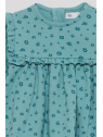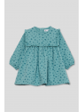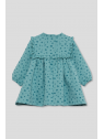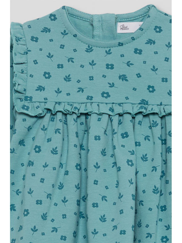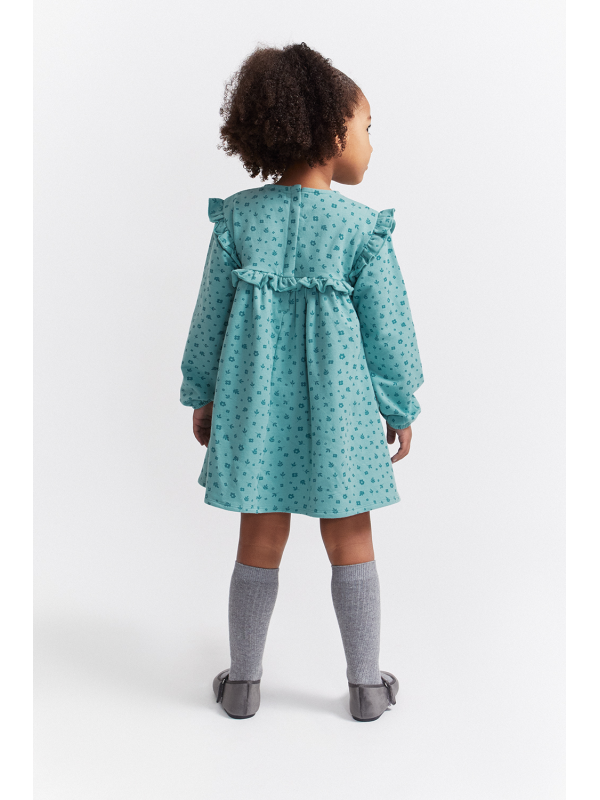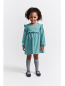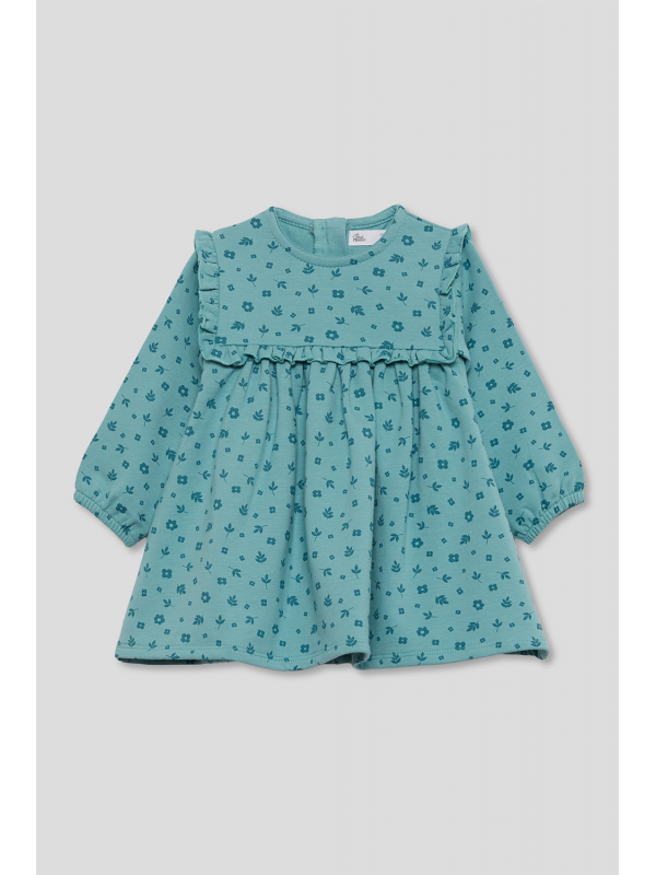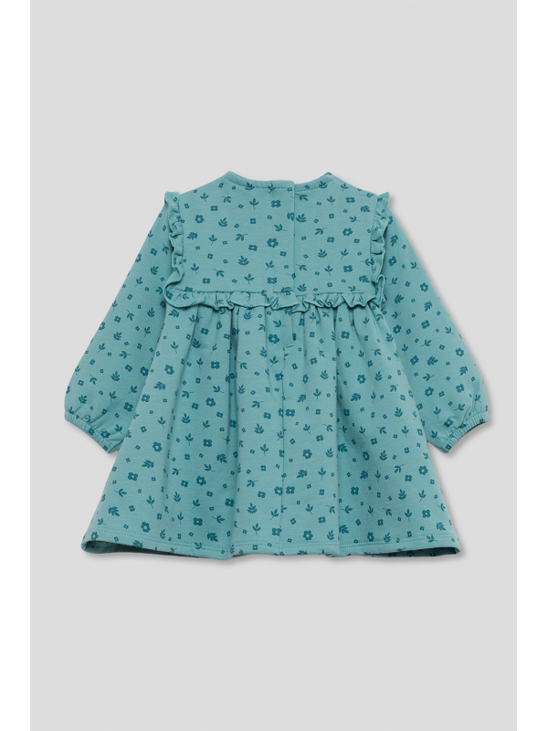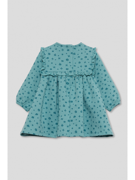 Vestido de niña de infantil, disponible desde la talla 3 meses hasta los 6 años. Vestido de manga larga en color verde amazona con delicado estampado floral en tono más oscuro. Presenta corte alto con frunce, volantes decorativos en los hombros y detalle de volante frontal y trasero a la altura del pecho. Cuello redondo y cierre trasero con botones para facilitar la puesta. Acabado en puños con goma suave. Confeccionado en felpa cálida y agradable al tacto, ideal para los días fríos.