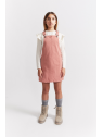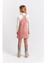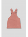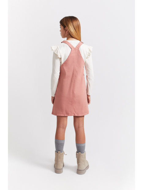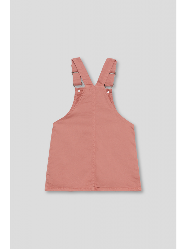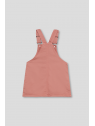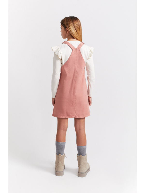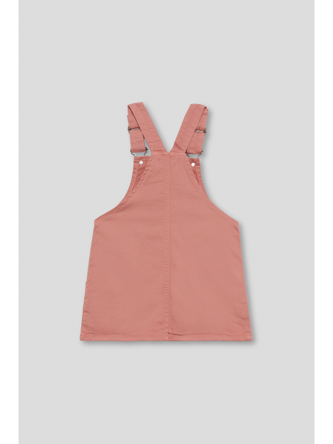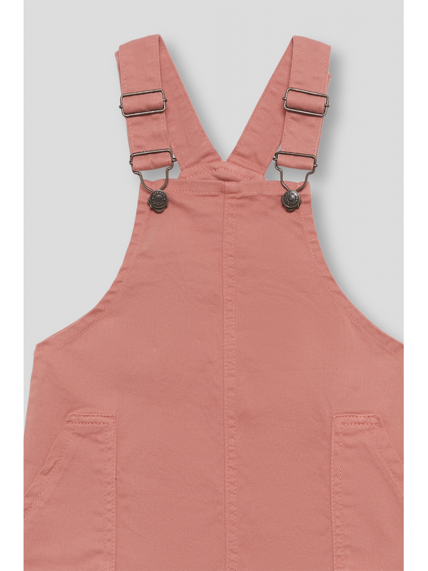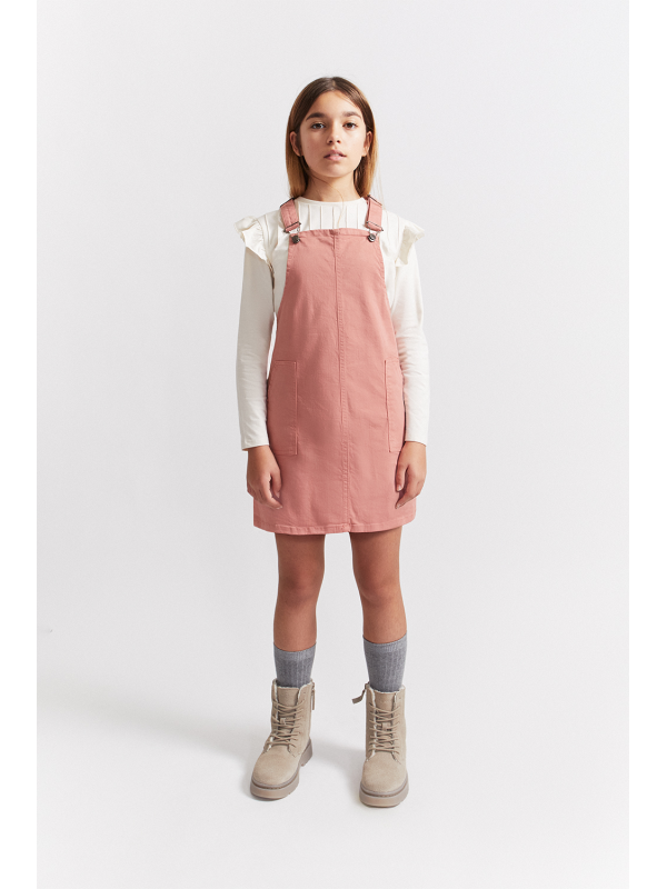 Pichi vestido en color maquillaje confeccionado en tejido de sarga suave con estructura recta. Presenta tirantes ajustables con hebillas metálicas, cierre lateral con botones a presión y dos bolsillos frontales de parche. Una prenda versátil y cómoda para combinar con camisetas o jerséis en los días más frescos.