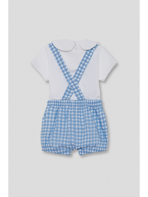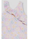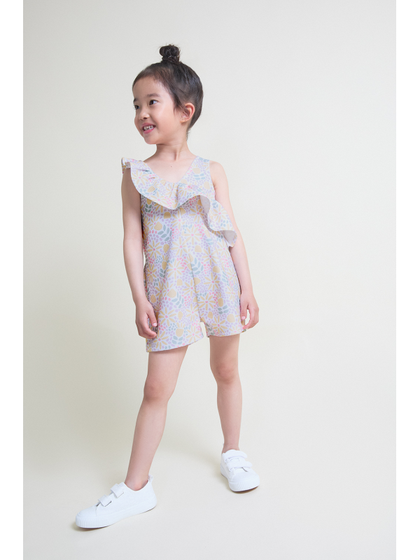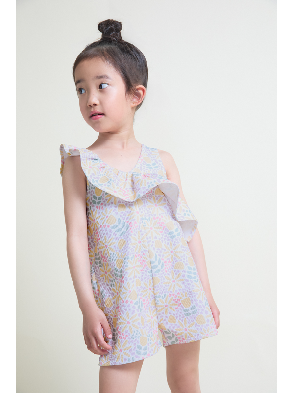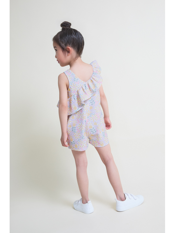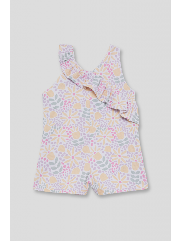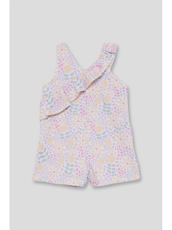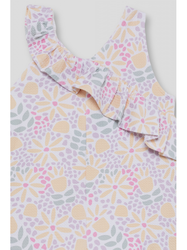 Mono corto para bebé niña de 3 meses a 6 años. Diseño estampado multicolor con flores y piñas, tirante ancho y detalle de volante diagonal en el pecho. Tejido ligero y cómodo para los días de verano.