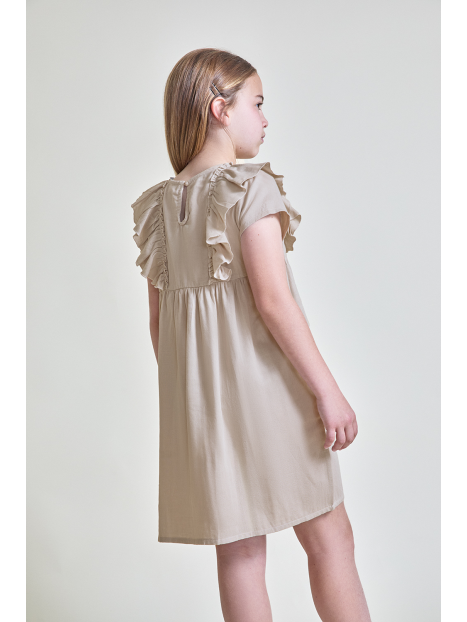 Diseño en color camel con volantes decorativos en el pecho y falda con vuelo. Confeccionado en tejido ligero y fresco, ideal para los días soleados de verano.