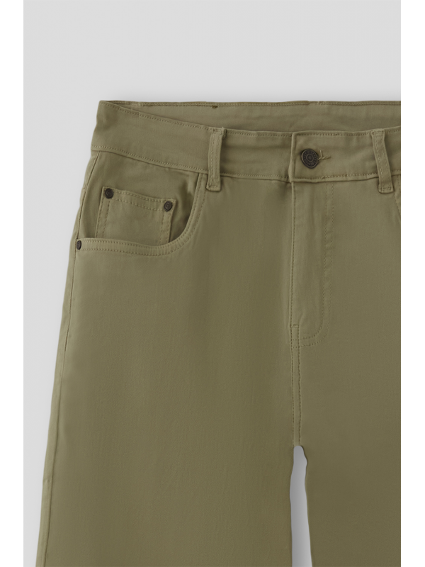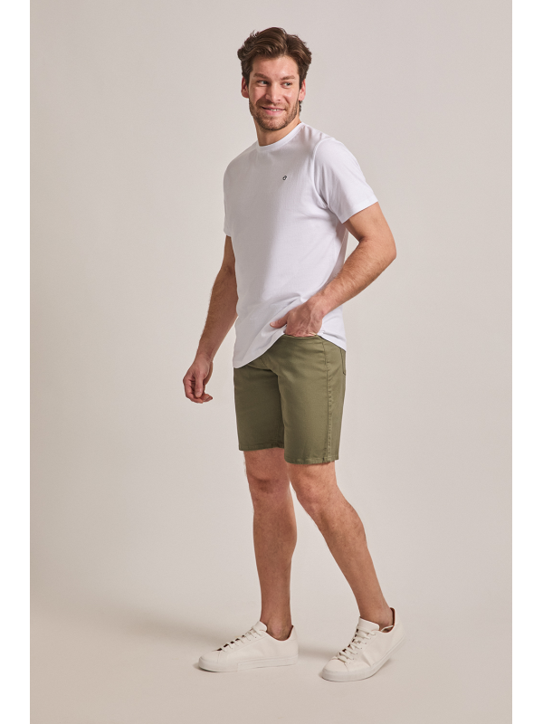 Bermuda estilo denim con cinco bolsillos. Cierre central mediante botón y cremallera, fornituras personalizadas y etiqueta en efecto piel en la cinturilla.