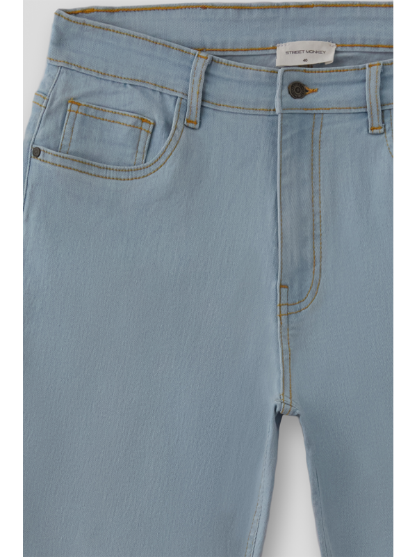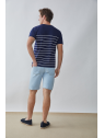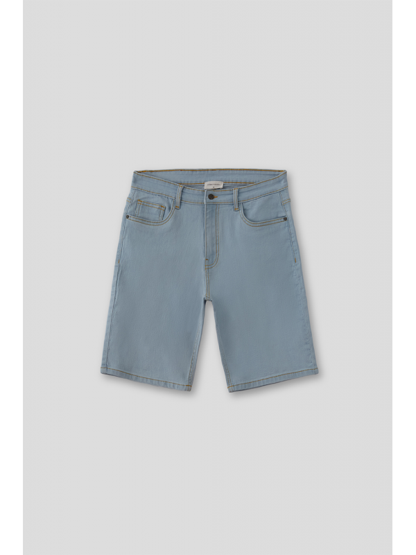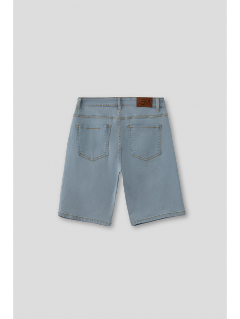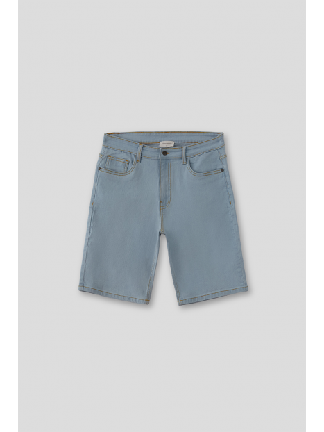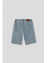 Bermuda estilo denim con cinco bolsillos. Cierre central mediante botón y cremallera, pespuntes en color camel, fornituras personalizadas y etiqueta en efecto piel en la cinturilla.