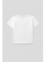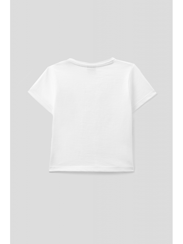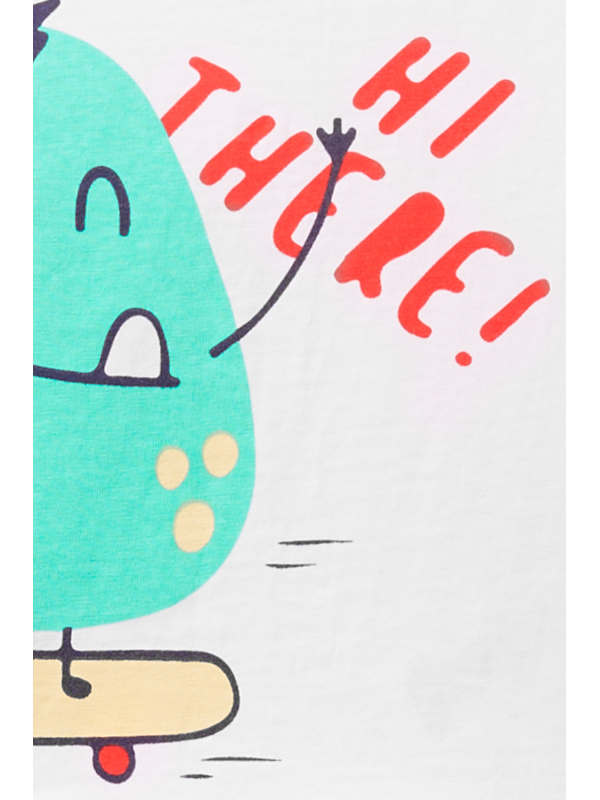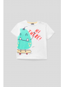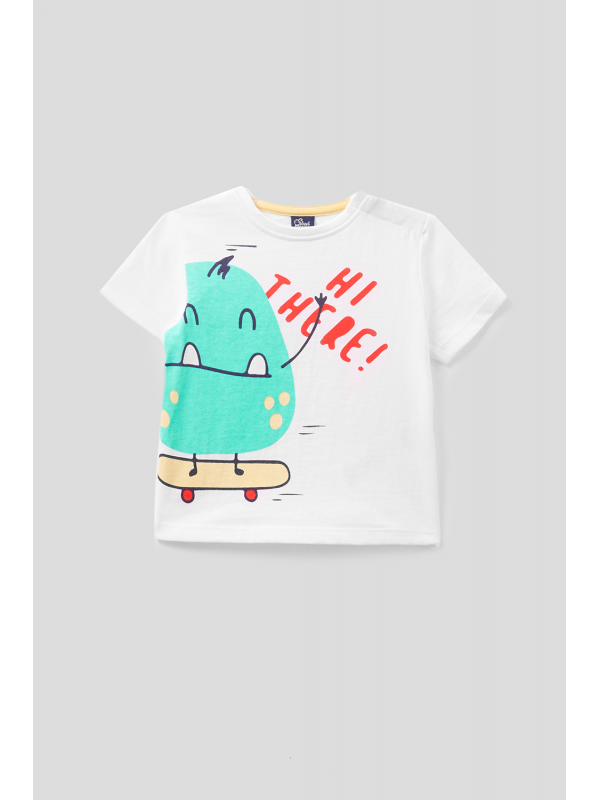 Camiseta de manga corta en color blanco con divertido estampado en el centro en color verde aguamarina, rojo y beige. Cierre con botones a presión en el hombro para las tallas de 3 - 24 meses.