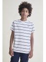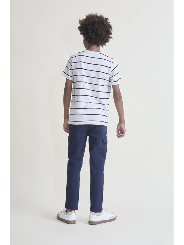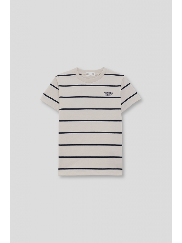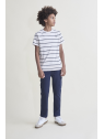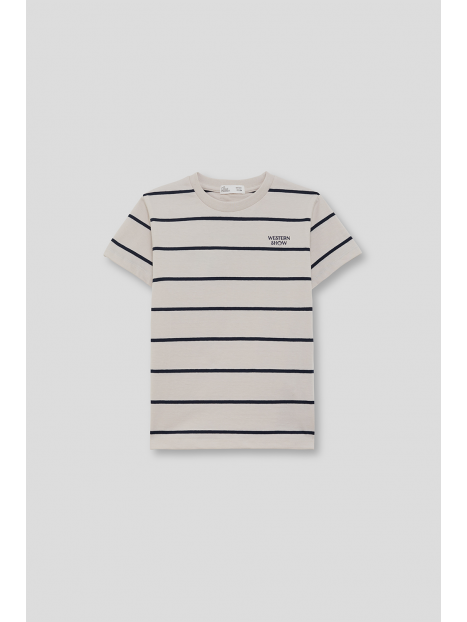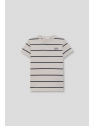 Modelo en color crudo con estampado de rayas marino y detalle bordado en el pecho. Tejido suave y cómodo, ideal para el día a día.