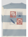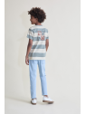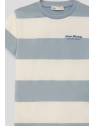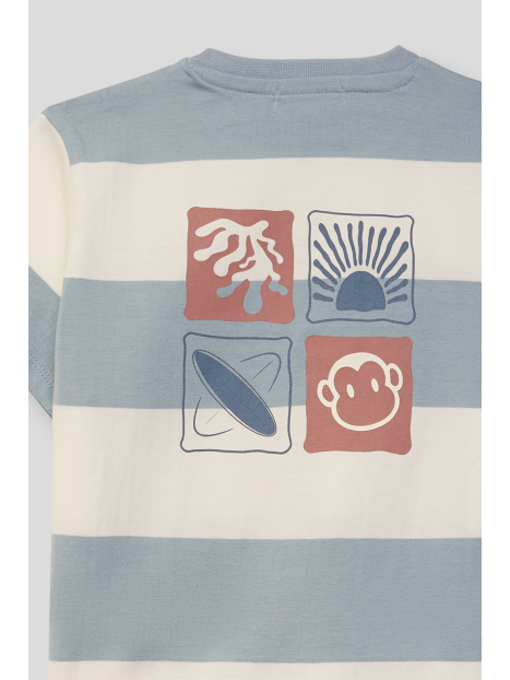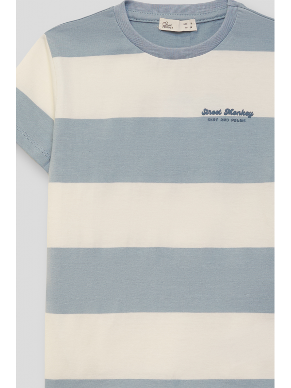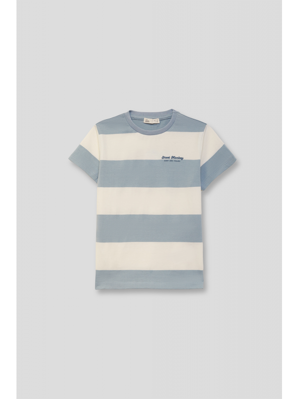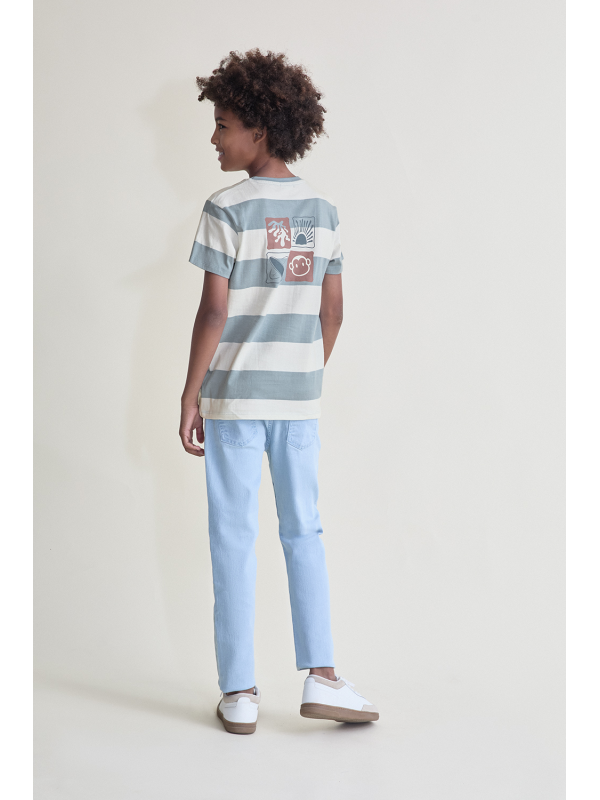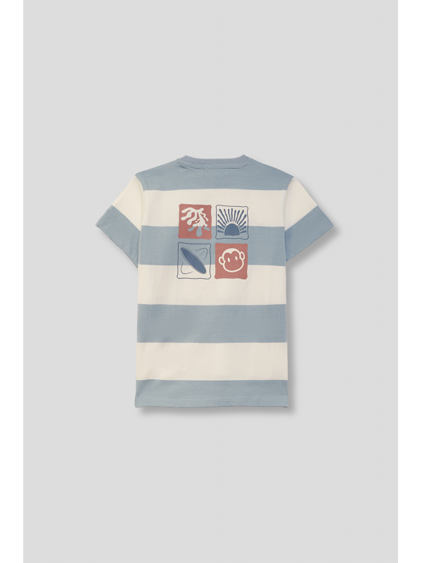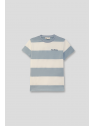 Camiseta de manga corta disponible en color azul medio con rayas crudo, en tallas de 2 a 16 años.