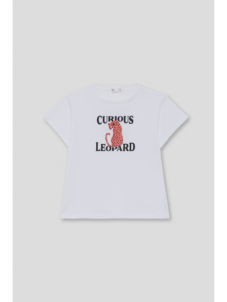Estampado central con leopardo y texto “Curious Leopard”, confeccionada en tejido suave y cómodo.