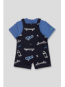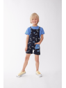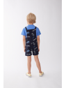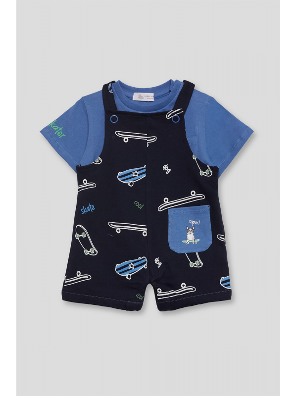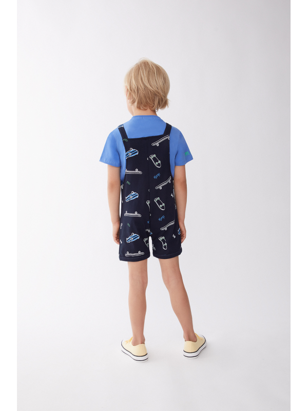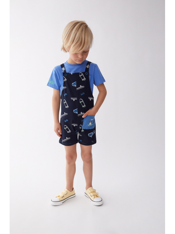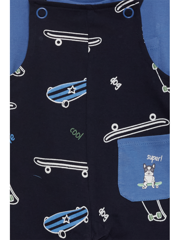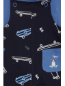 El peto coordinado, en un oscuro tono azul marino, presenta un estampado lúdico de patinetas en acción, perfecto para un pequeño en constante movimiento.