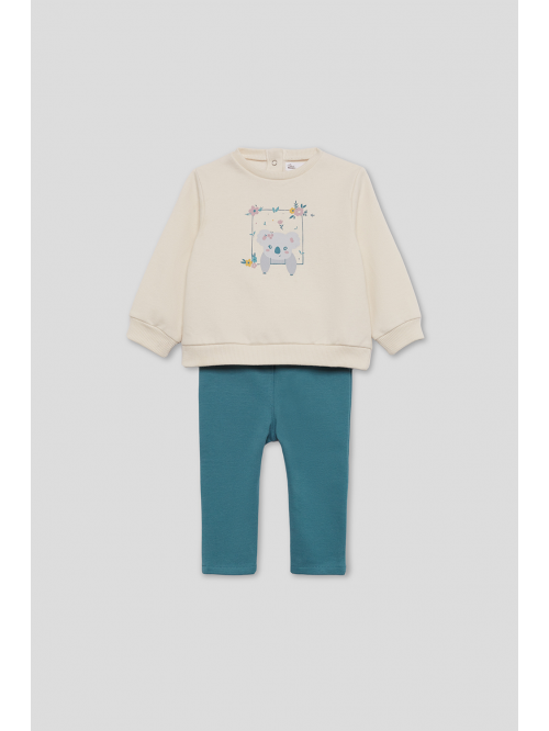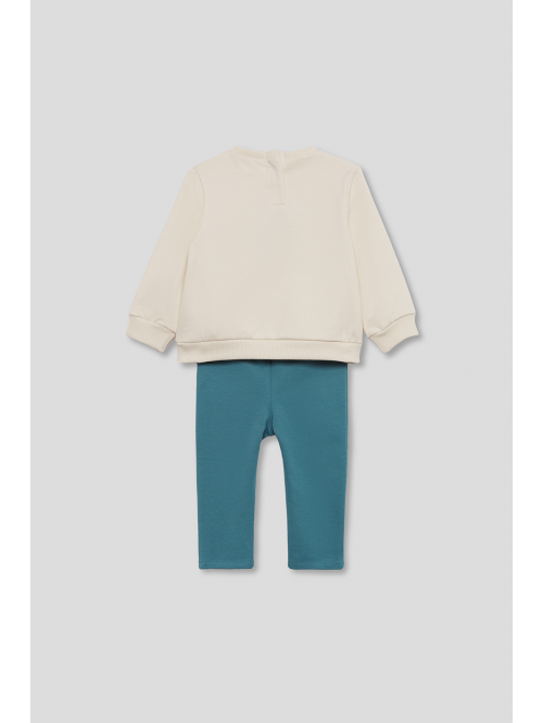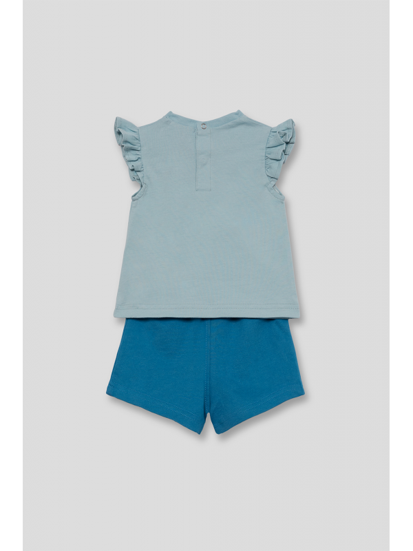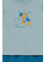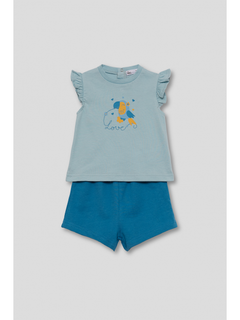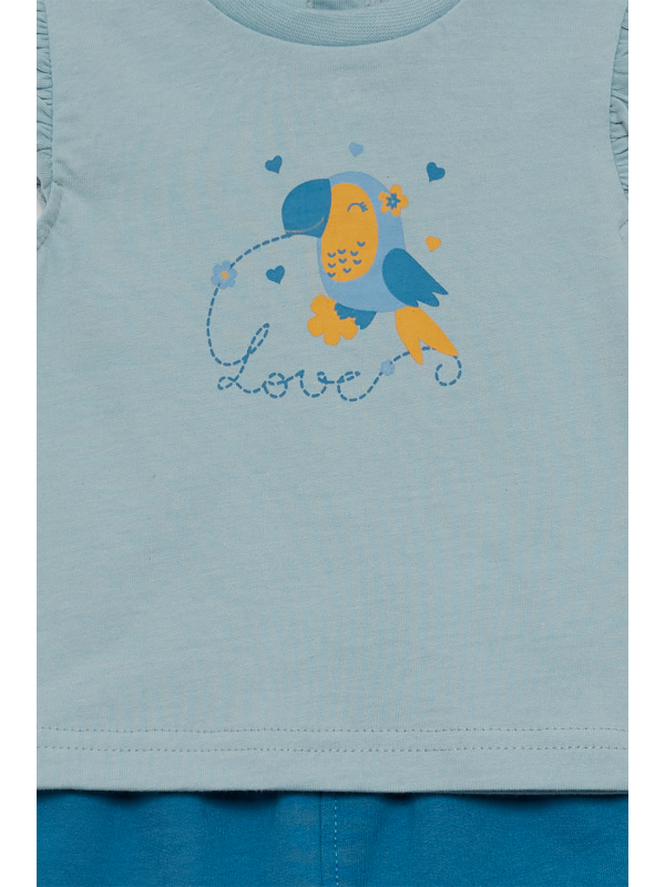 Este adorable conjunto destaca por su camiseta con un alegre estampado de un pájaro colorido formando la palabra "Love". Disponible en dos tonos frescos: un suave azul y un delicado verde agua, cada uno con shorts a juego que complementan perfectamente la camiseta. Los volantes en los hombros añaden un toque de dulzura y estilo.