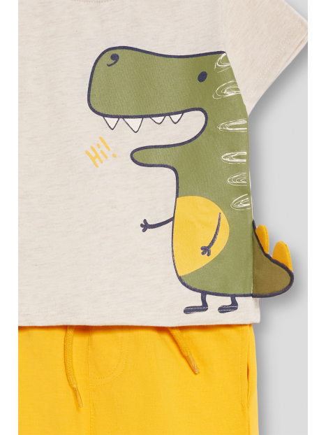 Camiseta en tono beige jaspeado con un divertido estampado de dinosaurio en relieve, con detalles en 3D que añaden un toque interactivo y original. En las tallas de meses, incluye cierre de botones en el hombro para mayor practicidad.