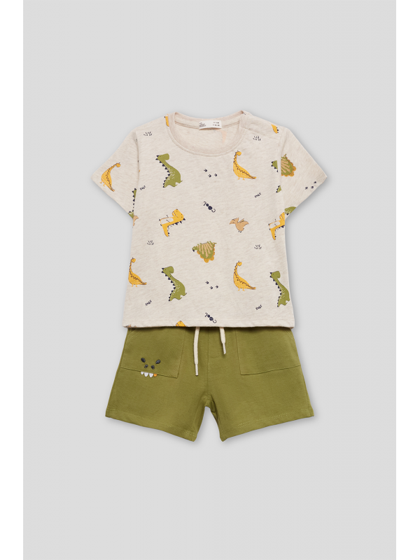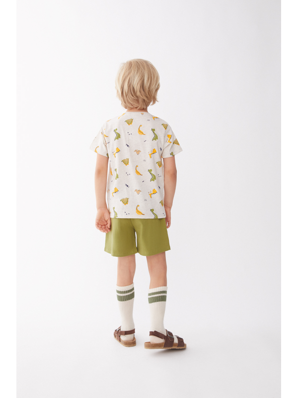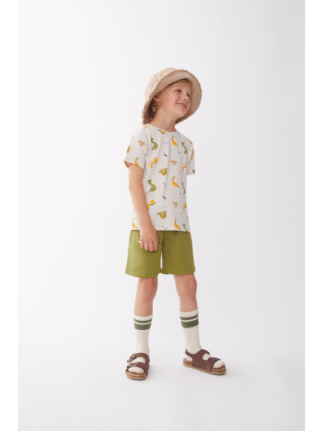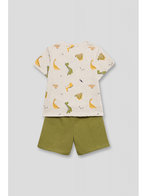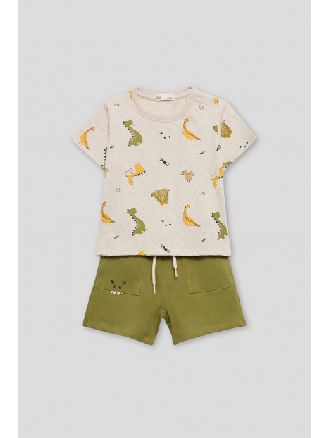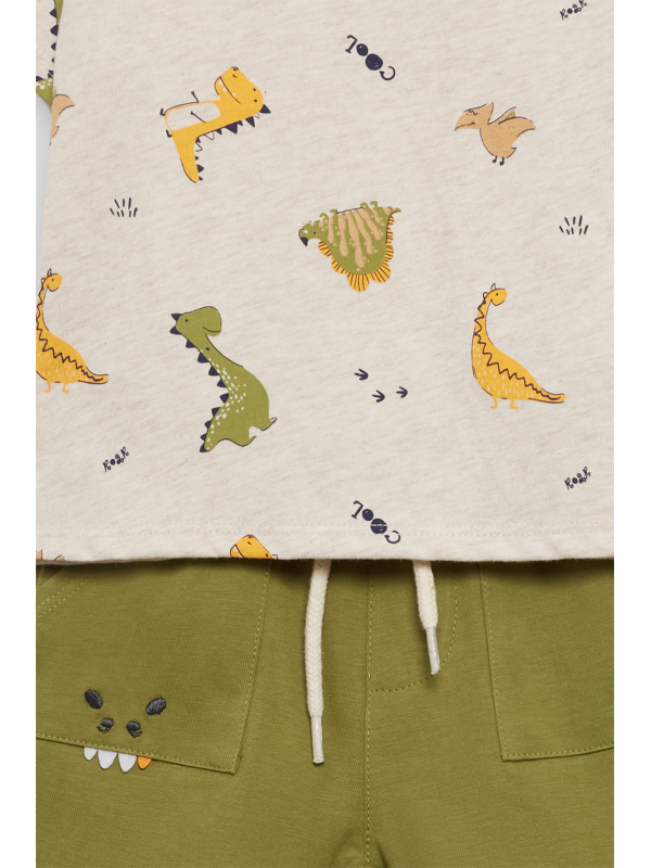 Camiseta en tono beige con un divertido estampado de dinosaurios en tonos verdes y amarillos, perfecta para los pequeños exploradores. En las tallas de meses, incluye cierre de botones en el hombro para mayor comodidad al vestir.