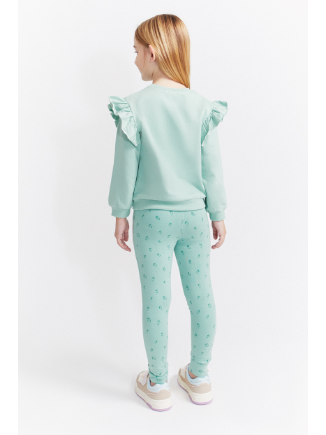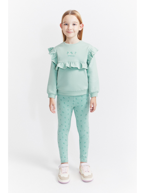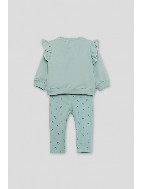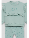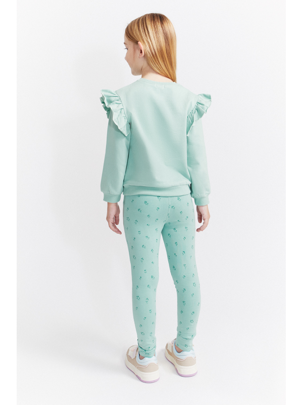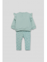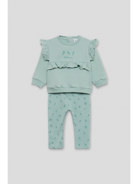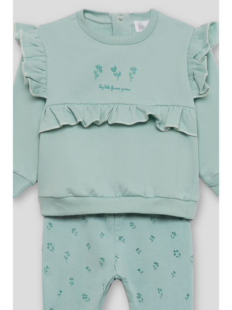 Conjunto de dos piezas, sudadera y leggings para niña de 3 meses a 6 años. Conjunto en tejido felpado disponible en color azulado. La sudadera luce un diseño delicado con volantes en los hombros y el pecho, rematados con vivo al tono, y un estampado central de florecitas con el texto "my little flower garden". Incluye cierre de botón en la espalda en las tallas de meses para facilitar la puesta. El legging largo, ajustado y muy cómodo, presenta un pequeño estampado floral a juego que completa el look con un toque encantador. Ideal para disfrutar del invierno con dulzura y libertad de movimiento.
