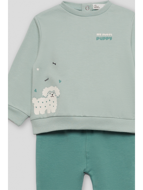 Sudadera de felpa perchada en color crudo con cuello redondo, estampado de perrito en la parte inferior y detalle bordado “My sweet puppy” en el pecho. Presenta acabados en canalé y un corte cómodo para el uso diario. Se combina con leggings largos disponibles en color verde claro o grosella, confeccionados en algodón elástico para mayor libertad de movimiento.