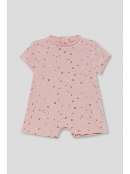 Pelele corto para bebé niña de 1 a 24 meses. Diseño en color blanco roto y rosa con estampado integral de pequeñas flores en tono maquillaje. Cuello redondo, manga corta y cierre con botones a presión en la espalda para facilitar el cambio. Confeccionado en tejido suave y ligero, ideal para el verano.