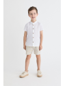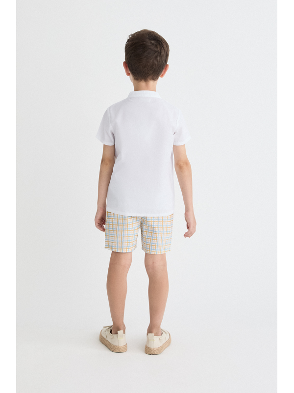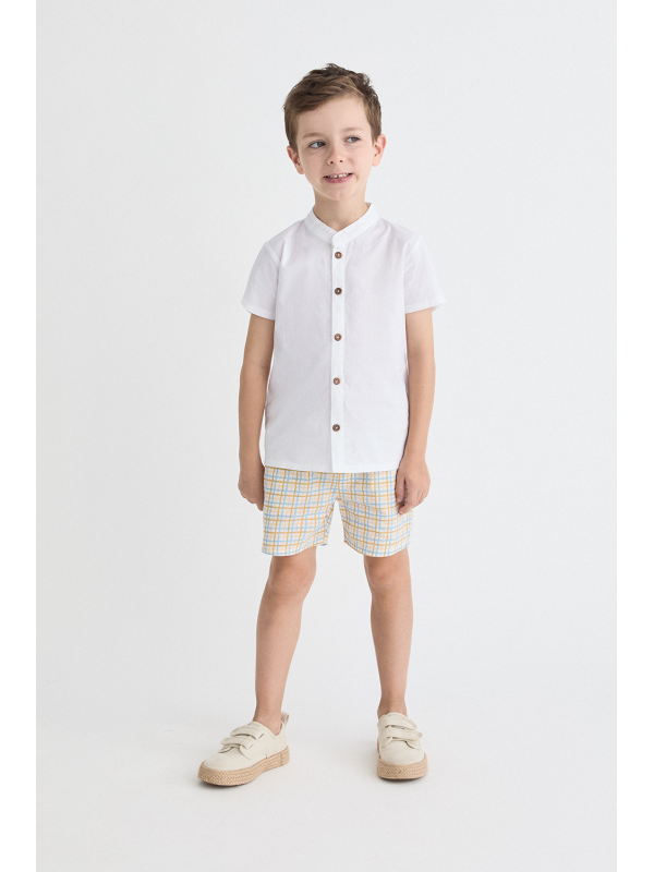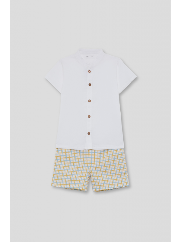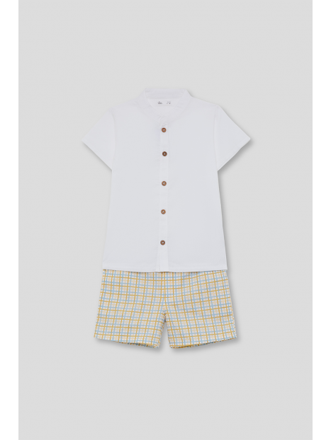Camisa blanca de manga corta con botones de madera y cuello mao. Pantalón corto en cuadro amarillo y azul, con cintura elástica para un ajuste cómodo.