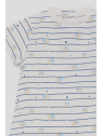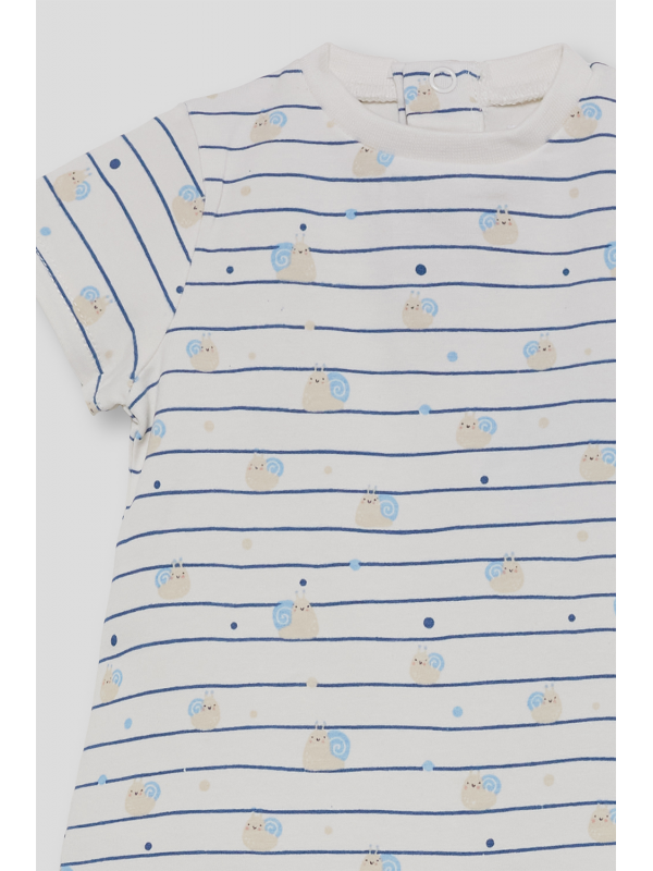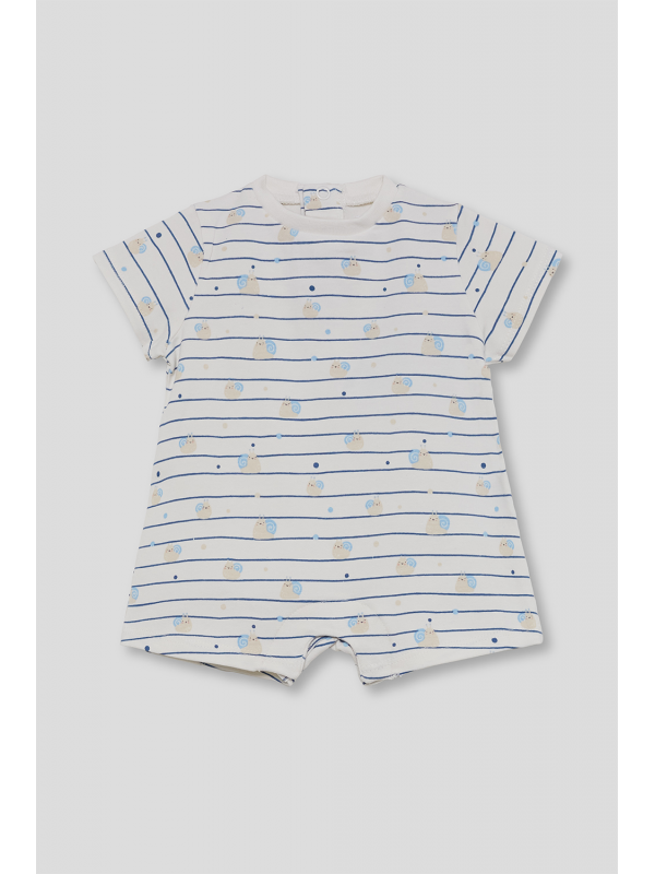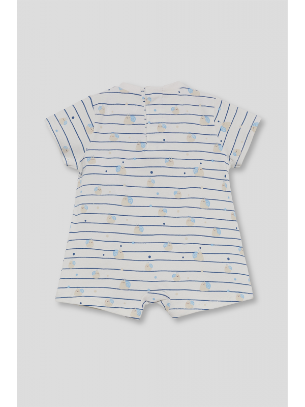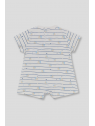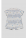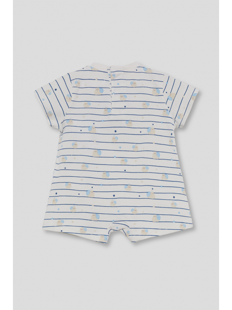 En color celeste y crudo con estampado de rayas y pequeños motivos marinos. Cuello redondo y cierre con botones a presión en la espalda y entrepierna para facilitar el cambio.