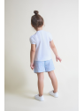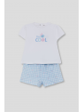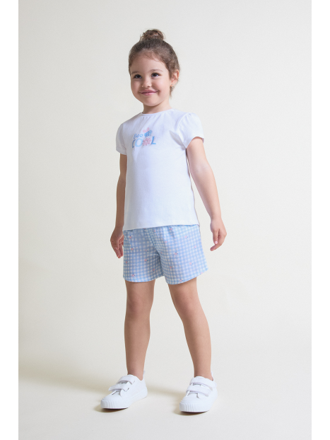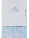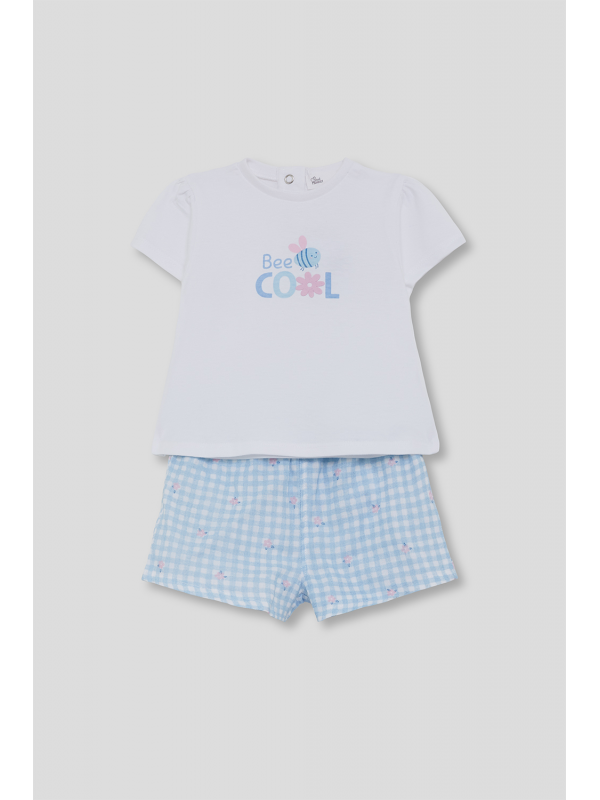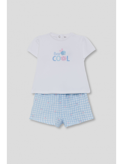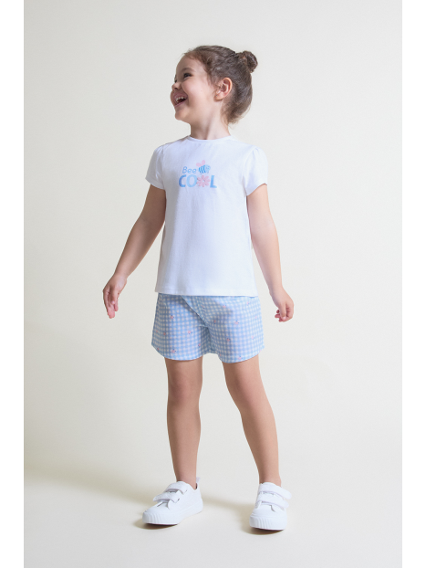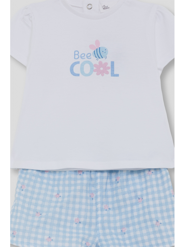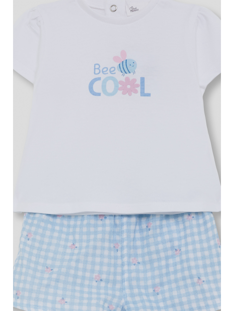 Camiseta blanca con estampado frontal “Bee Cool” y detalle de abeja. Shorts en cuadro vichy azul con mini flores, cintura elástica para un ajuste cómodo.