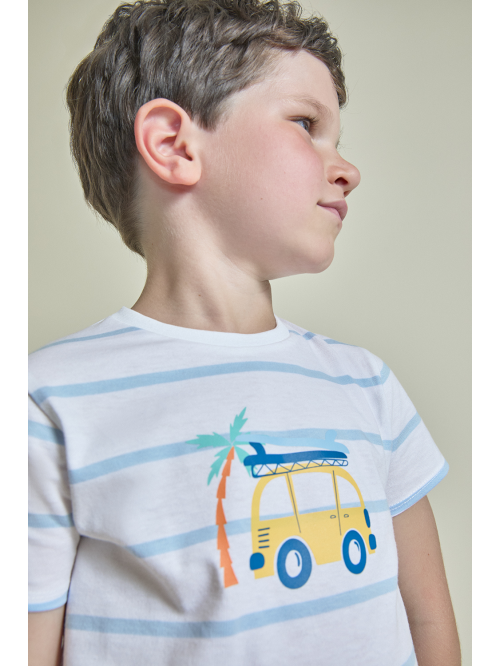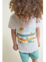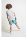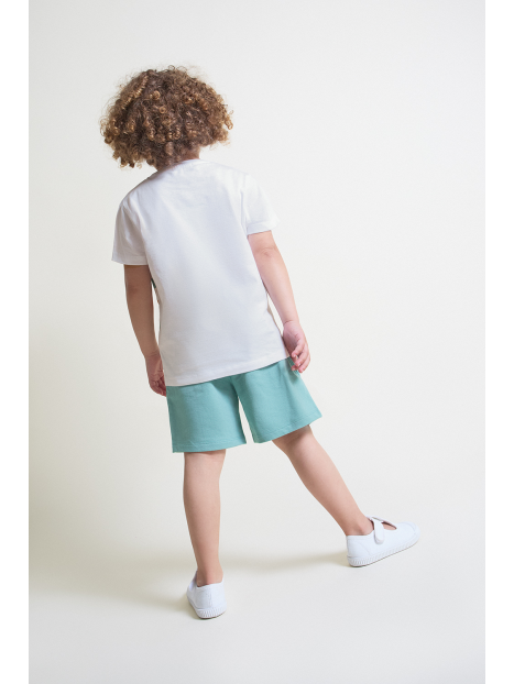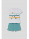 Camiseta blanca de manga corta con franjas de colores y estampado de dinosaurios. Shorts en color verde con cintura elástica y bolsillos delanteros.