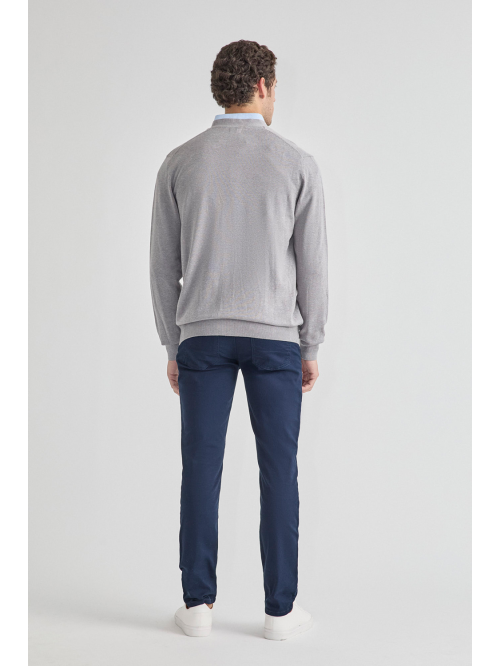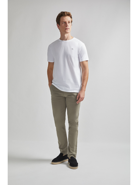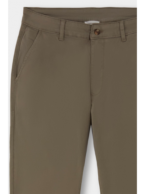 Pantalón estilo chino con cierre central mediante botón y cremallera, dos bolsillos en el frontal y dos en la parte trasera con detalle personalizado a contraste sobre uno de ellos. Corte recto.