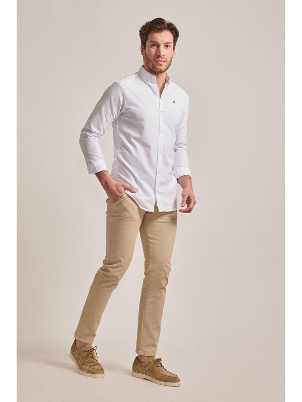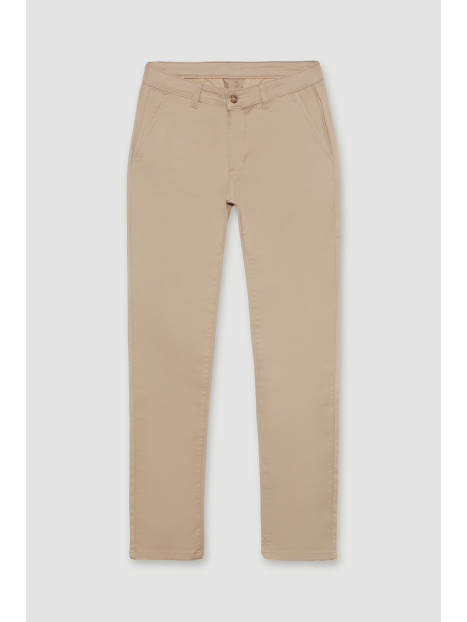 Pantalón estilo chino con cierre central mediante botón y cremallera, dos bolsillos en el frontal y dos en la parte trasera con detalle personalizado a contraste sobre uno de ellos. Corte recto.