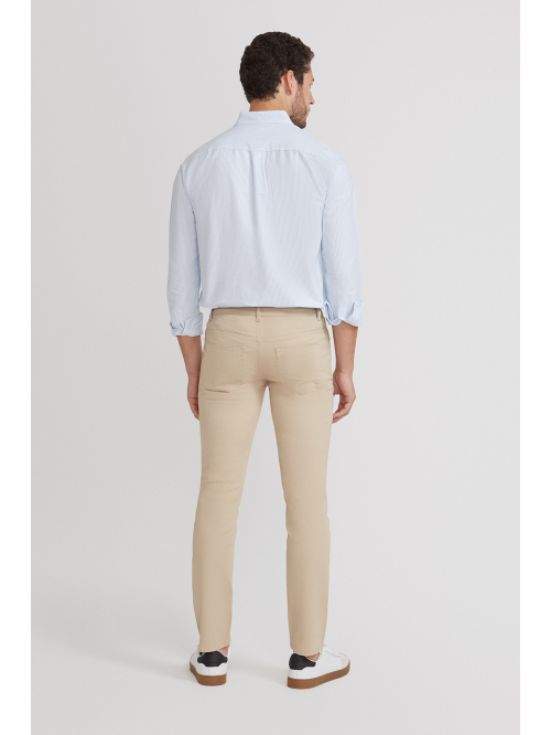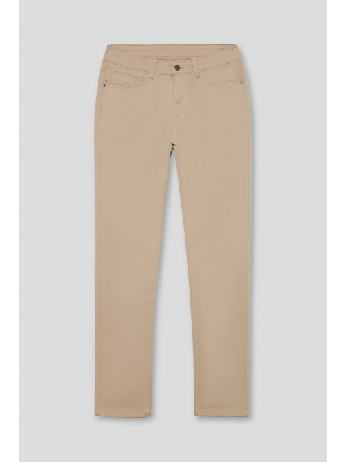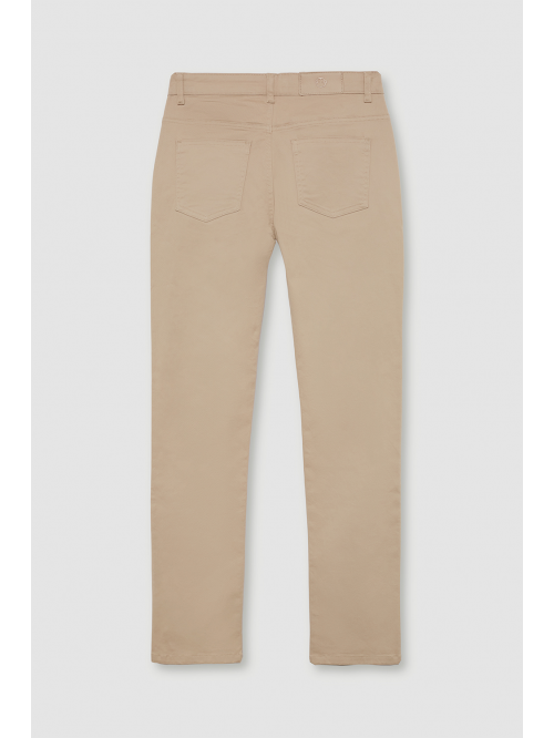 Pantalón cargo con cierre central mediante botón y cremallera. Dos bolsillos frontales y dos más bajos con cierre mediante tapeta y botón. Dos bolsillos traseros y detalle personalizado sobre uno de ellos. Corte recto.